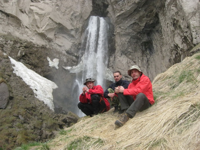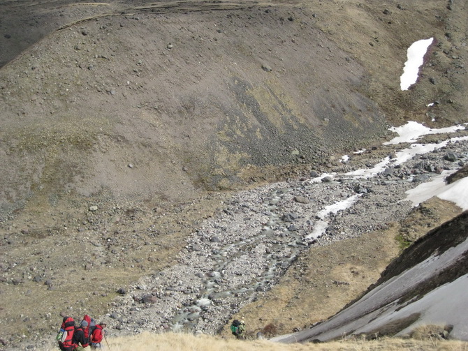 Спускались еще в тот день пять или шесть часов. Углубилось ущелье. Более мощным и выраженным стал ручей Ирик. Он местами был зажат между каменных глыб, образуя водоскаты и водопадики. Постепенно по мере сброса высоты обогащалась флора. Совсем уже исчезли снежные лоскуты, и наконец, мы вышли на уверенную довольно широкую и плоскую лужайку с первой травой и отдельными причудливо разбросанными здесь камнями. Торопиться не торопились. Решено было пообедать. Обедать старались расширенно, поскольку были еще свободные продукты. Само-собой, заработал опять спиртовой сектор. Сюля был те дни в не у дел, теперь приходилось быть внимательным и постоянно начислять. Сиделось хорошо, в развалочку. В звене Голубов случились препирательства из-за чеснока.