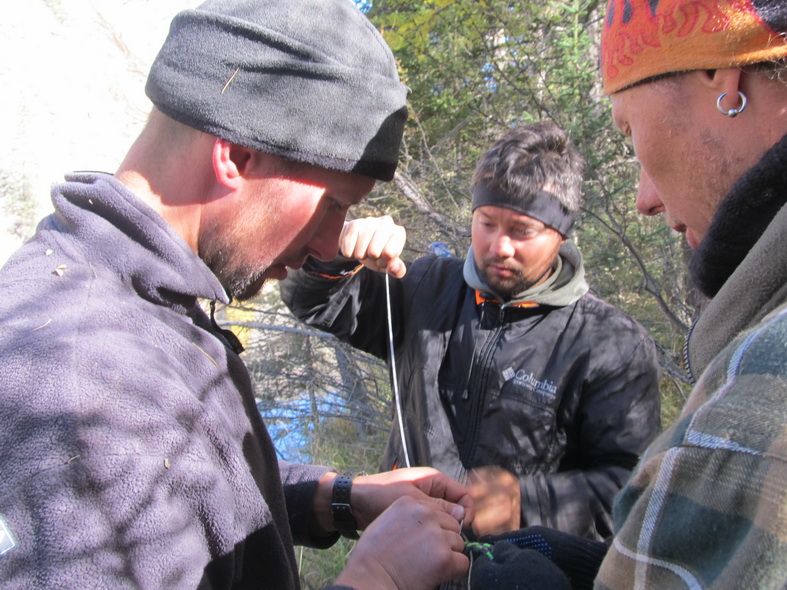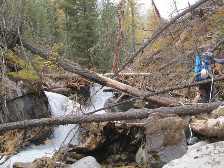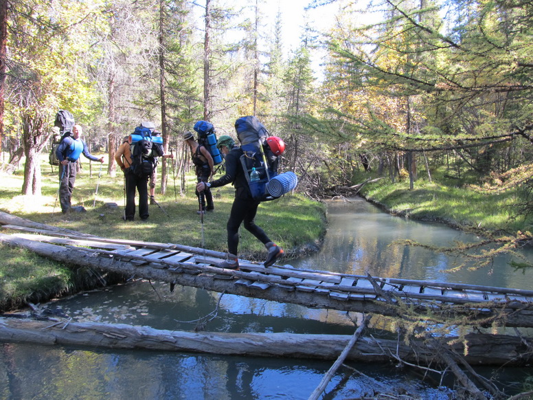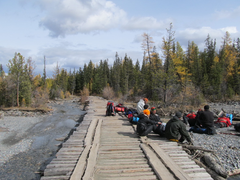 Чуя течет здесь в теснине. Не торопились с утра с переправой: ожидали, когда нас посетит солнце. Нужно было на сук удобной лиственицы забросить веревку. К камню привязали репик. Но камень с репиком туда не долетал. Саша Большой спросил суровую нить. Он смастерил из превосходной черемуховой палки лук, а к стреле, значит, это, привязал нить. С первого же выстрела стрела перелетела через массивную надежную ветку. За нить вытянули реп. За реп и основную веревку. Глаз залез и закрепил. Витя с Юрой переплыли и закрепили на противоположном берегу другую. Глазу подали другую. Когда через ветку тянули полиспаст, сидеть на раскачивающейся лиственице было страшно. Рюкзаки вытягивали стоящие внизу через закрепленный на верхней станции карабин. На первом же рюкзаке случился конфуз. Он завис за счет провиса веревки, отъехав совем чуть-чуть. Запустили A.by, как человека смекалистого и умеющего быстро импровизировать. Но и A.by вместе с толкаемым рюкзаком прилично не доехал до того берега и опять же вместе с рюкзаком висел над водой, пружинил и по пол оборота вращался. Благо на Поляне Смирнова играли в Маашей Баши. В этом походе, что-либо с той игры хоть один раз да пригодилось. Продвинулся Андурша до нужной елки подтягиваясь за жумар. Там его и приняли.