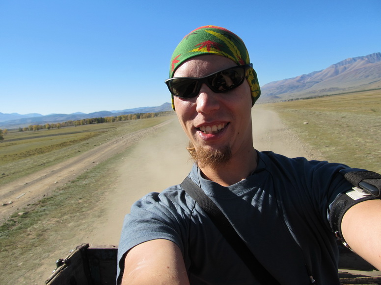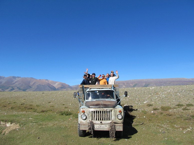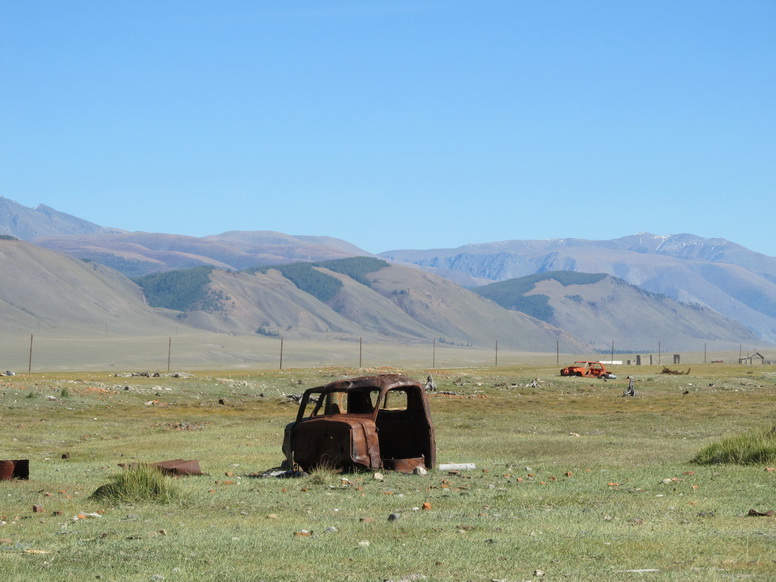 Но долго нам не пришлось идти пешком по Курайской степи. С левого фланга по ходу нашего движения зашел развалюха старая Mazda-ГАЗ 53. В кабине двое алтайской внешности, но - не пьяные. Разумеется, что им по пути и, разумеется, что подвезти не за бесплатно. Вышло 1000 рублей со всех. Погрузились в кузов.