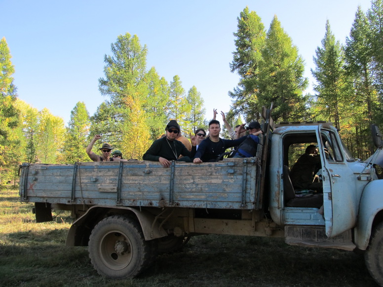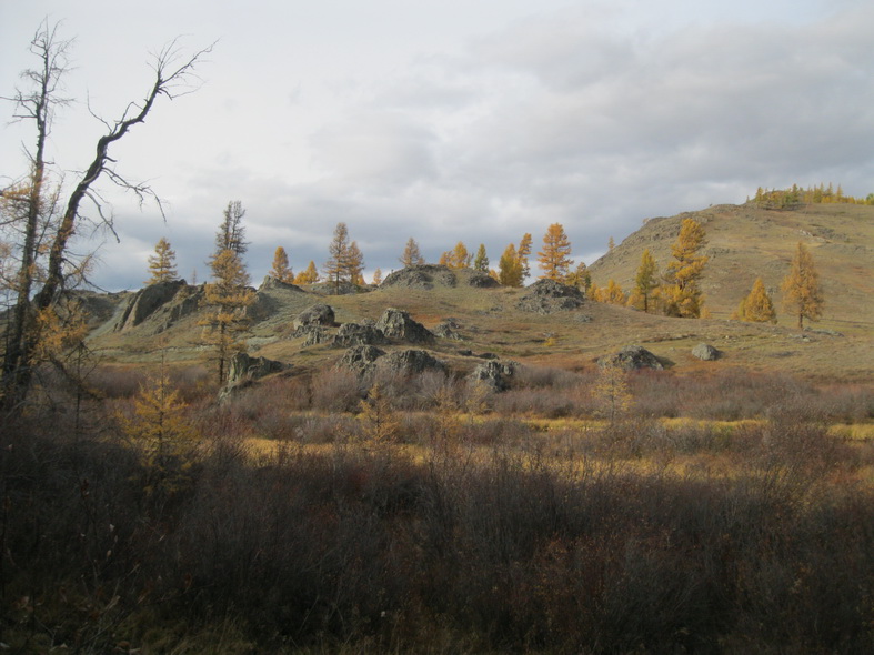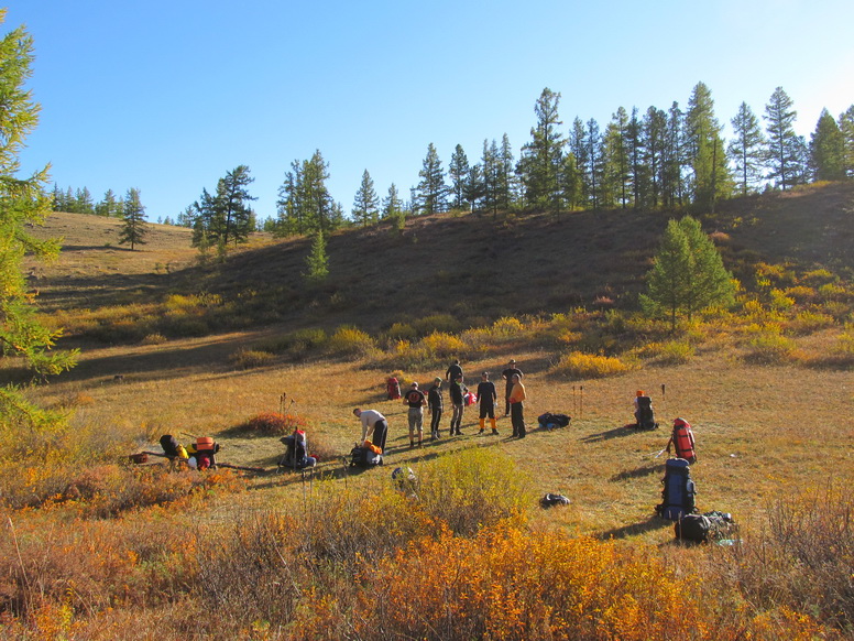 Сегодня мы поднялись, вышли и собрались довольно поздно. Немного шли пешком, плюс какое-то время ехали на ГАЗоне. В общем дело клонилось к вечеру. Мы перешли небольшое болотце и дальше уже недолго по краю лиственичного редколесья.