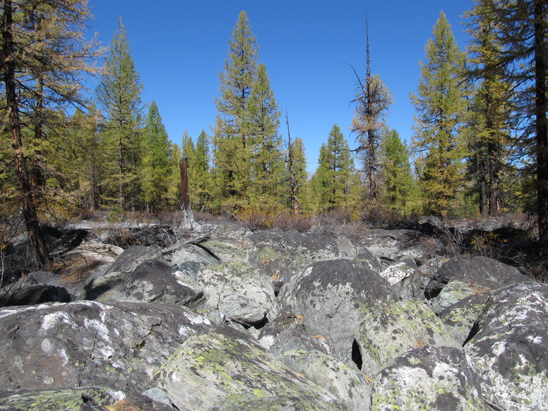 Шли дальше мы не очень важно, зато уютно и живописно. Лиственичный лес стал более редок, уже не такой тенистый и густой. Сквозь кроны пробивало солнце. Была здесь, как всё равно каменная река. Четко ограниченный и аккуратный поток серых валунов. Под камнями, было слышно, журчала вода. Но никак туда не долезть.