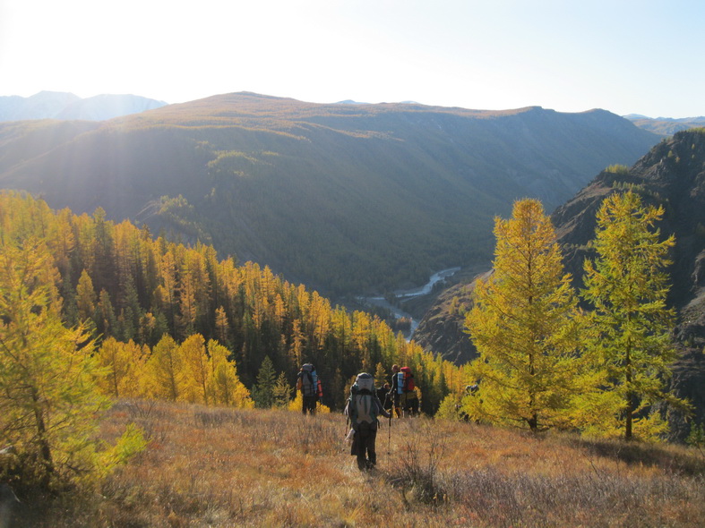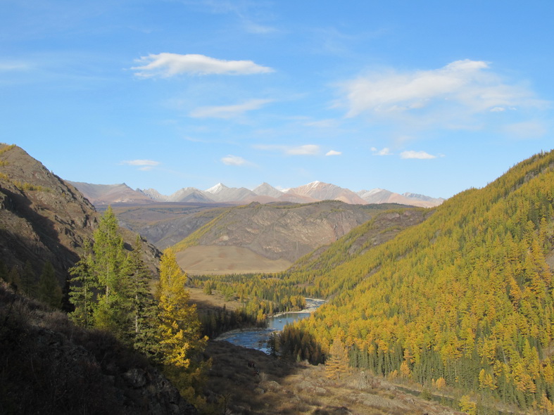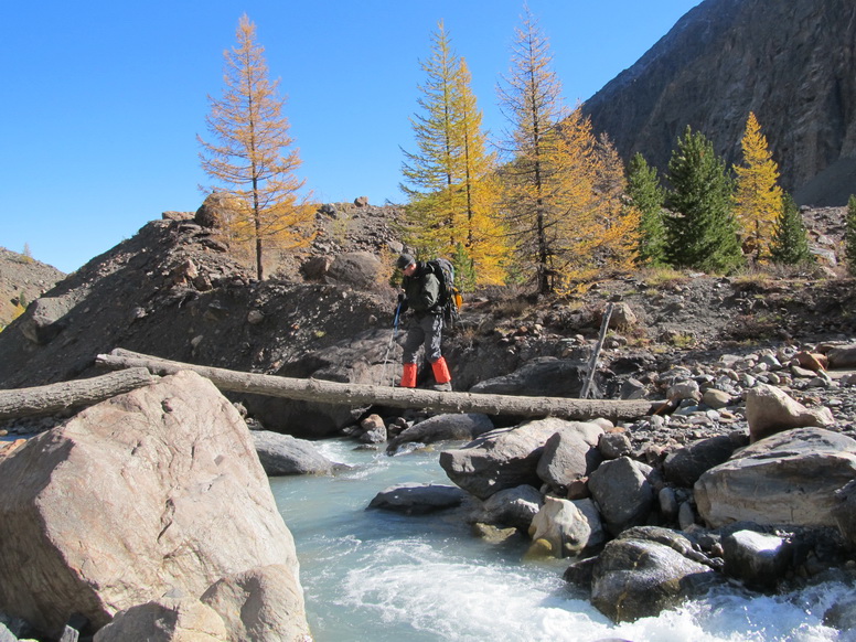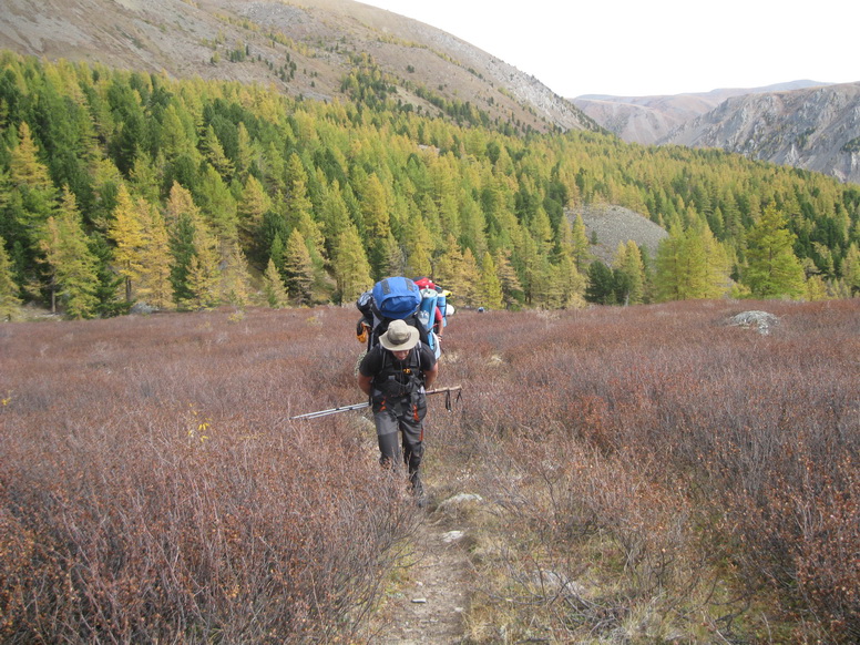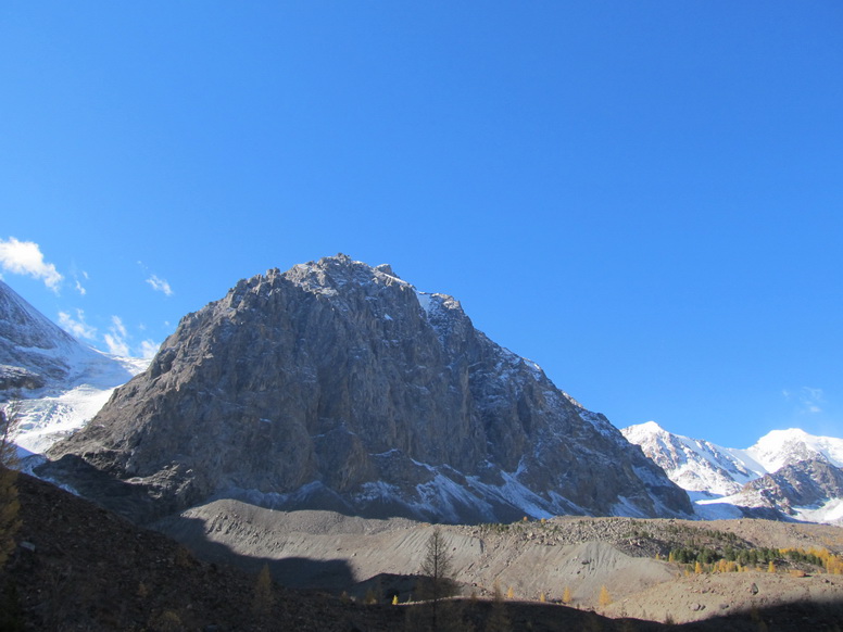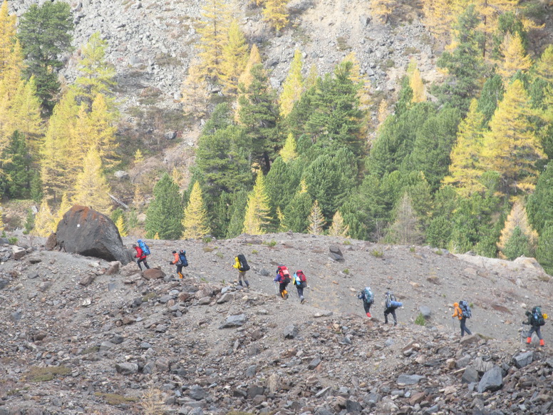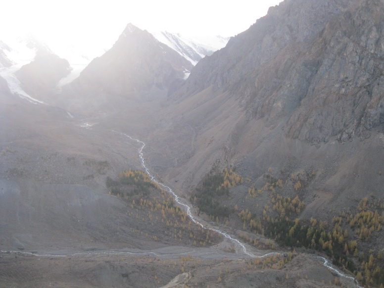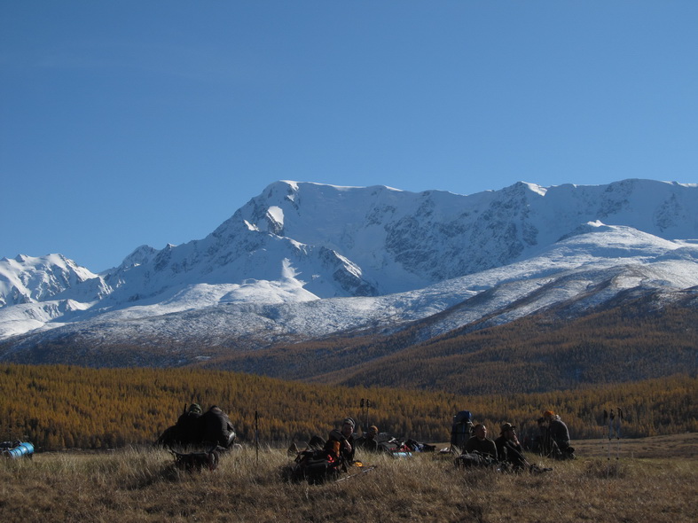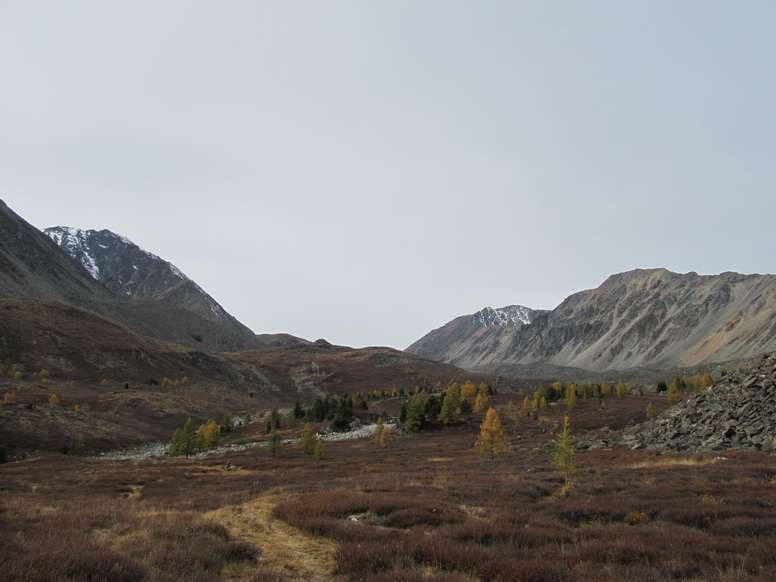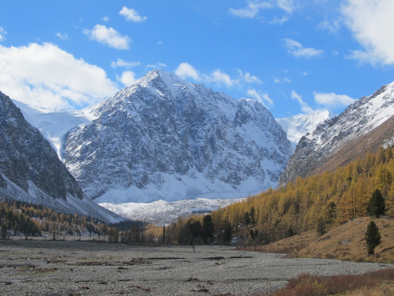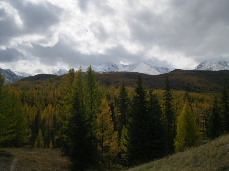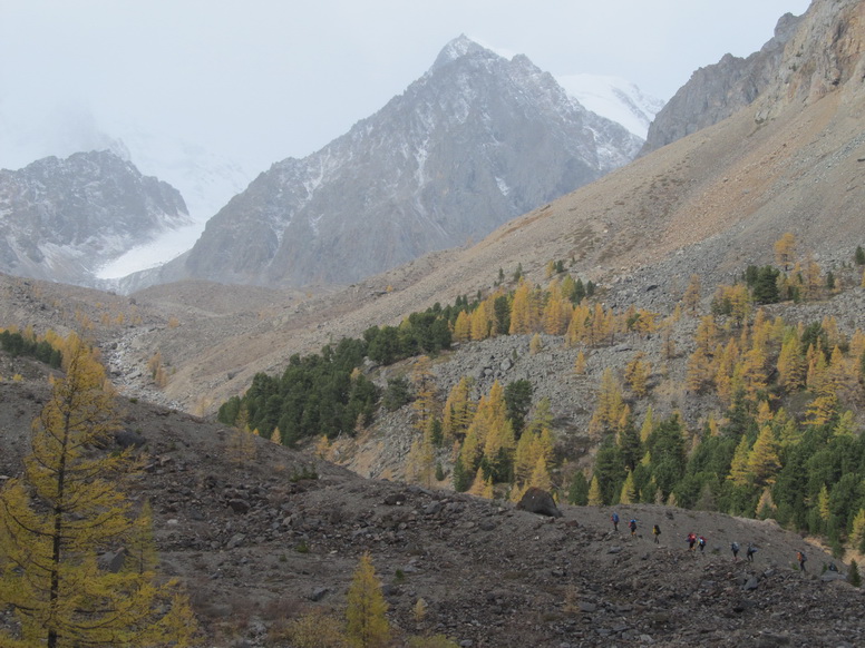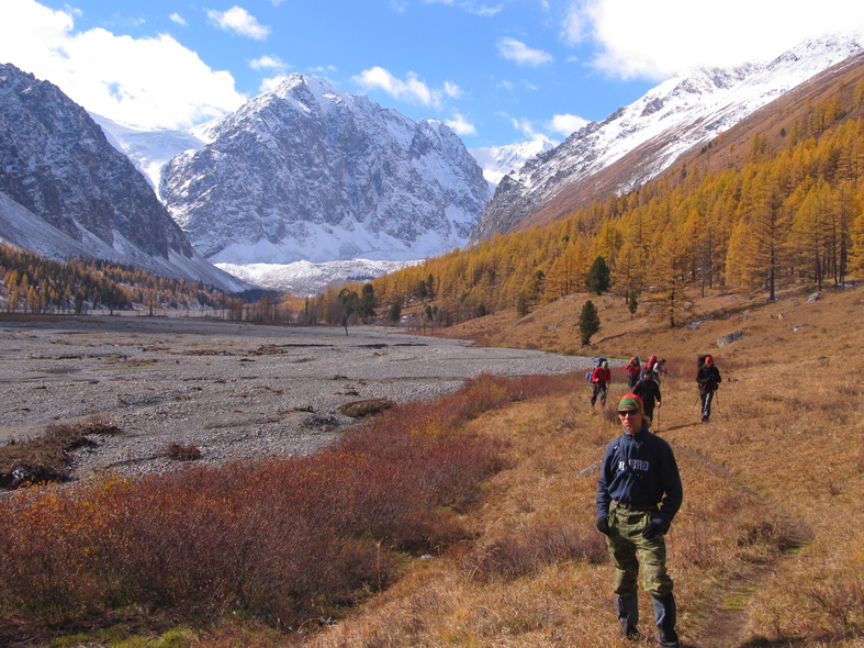 То, где мы шли, называется Курайская степь. По ту сторону Чуйского тракта, куда мы не шли, поднимались безлесные горы. Сверху, и в своих морщинах, и в кулуарах они были припорошены снежком. С нашей стороны, куда мы шли, громоздились горы по значительнее, с ледниками. Ледники белоснежные с голубым отливом на затененных сторонах. Перед горами предстал ковер из сливающейся воедино оранжево-желтой увядающей хвои листвениц. Сочетание этих лиственниц в пору золотой осени со снегом, камнем и насыщено-голубым небом видел я, пожалуй, только лишь единожды - в Магаданской области. Красива необычайно осень и в лесотундре Кольского полуострова, но там она своя, другая – совсем не такая как здесь.