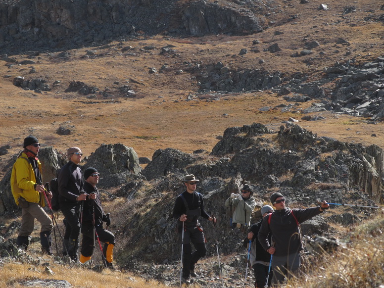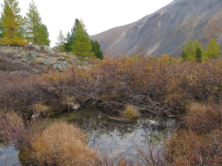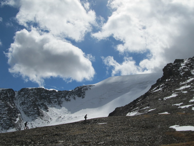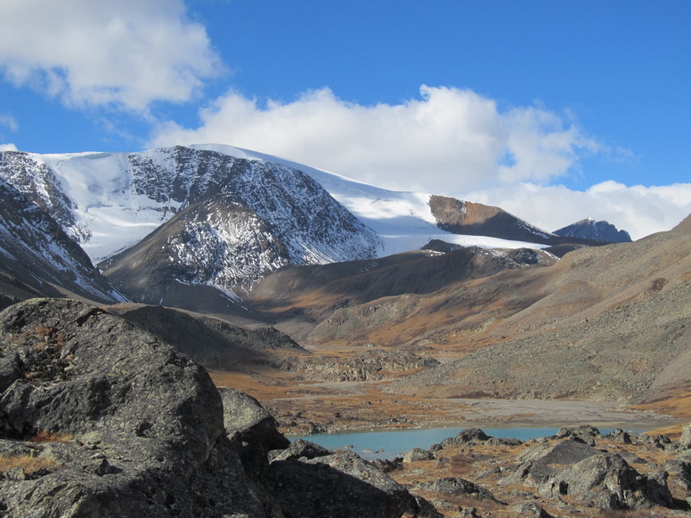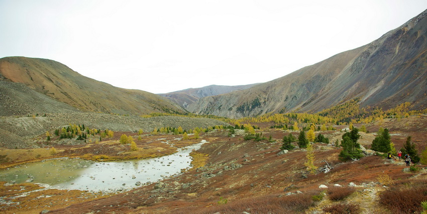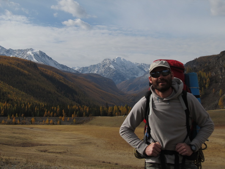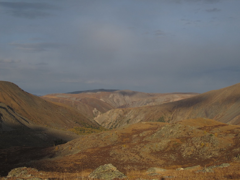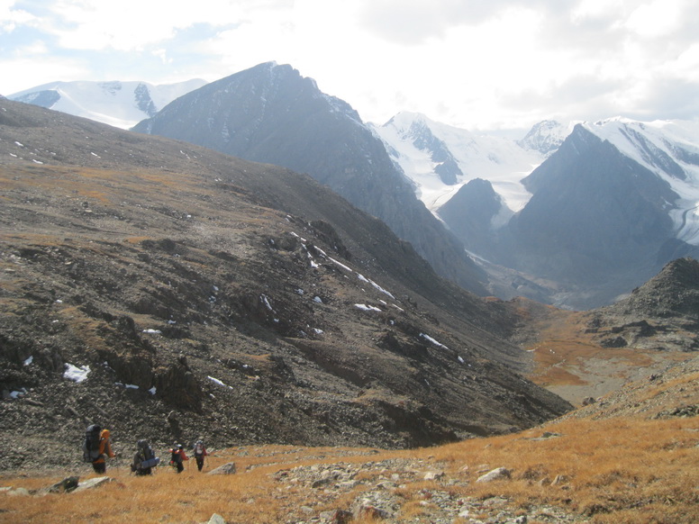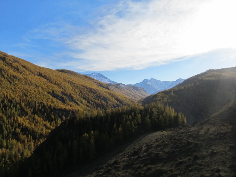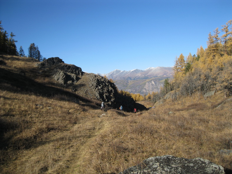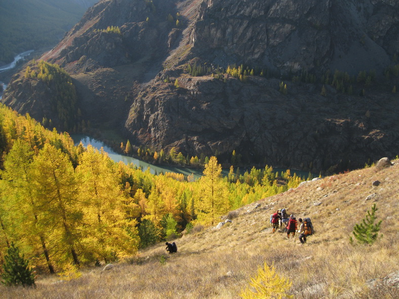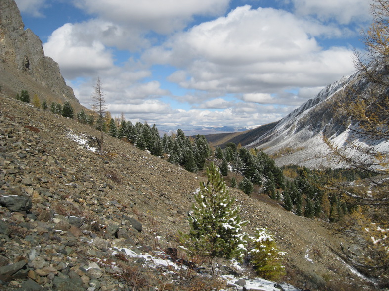 То, где мы шли, называется Курайская степь. По ту сторону Чуйского тракта, куда мы не шли, поднимались безлесные горы. Сверху, и в своих морщинах, и в кулуарах они были припорошены снежком. С нашей стороны, куда мы шли, громоздились горы по значительнее, с ледниками. Ледники белоснежные с голубым отливом на затененных сторонах. Перед горами предстал ковер из сливающейся воедино оранжево-желтой увядающей хвои листвениц. Сочетание этих лиственниц в пору золотой осени со снегом, камнем и насыщено-голубым небом видел я, пожалуй, только лишь единожды - в Магаданской области. Красива необычайно осень и в лесотундре Кольского полуострова, но там она своя, другая – совсем не такая как здесь.