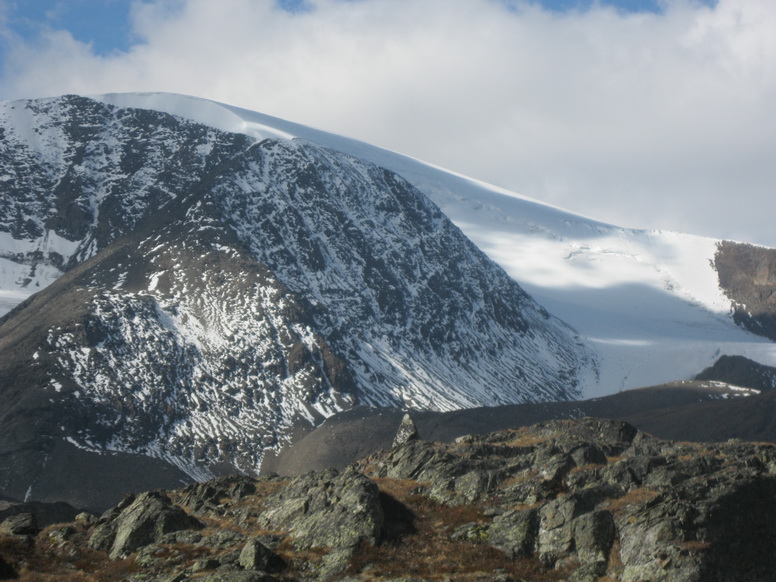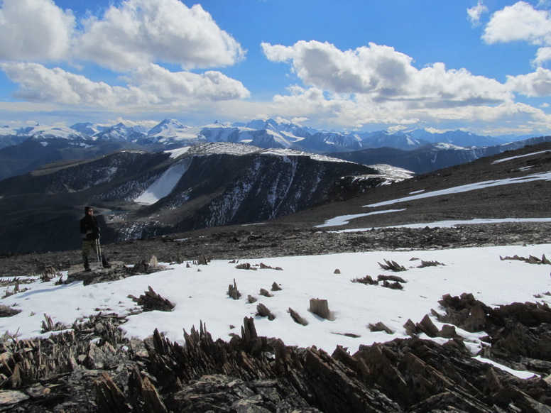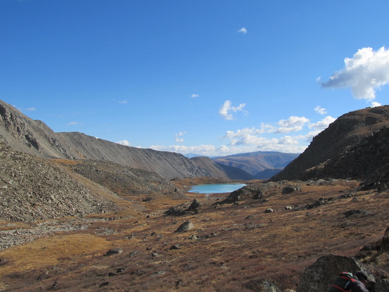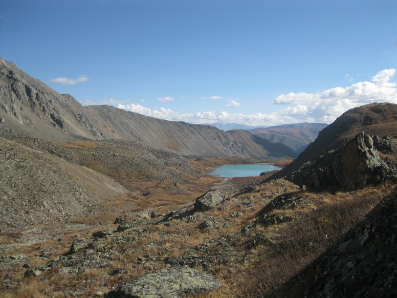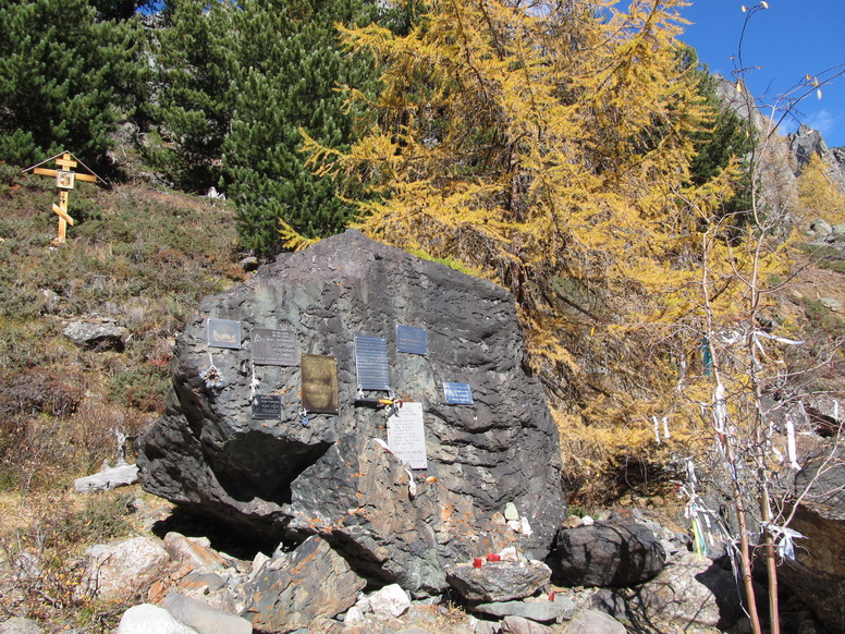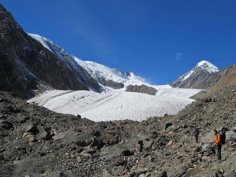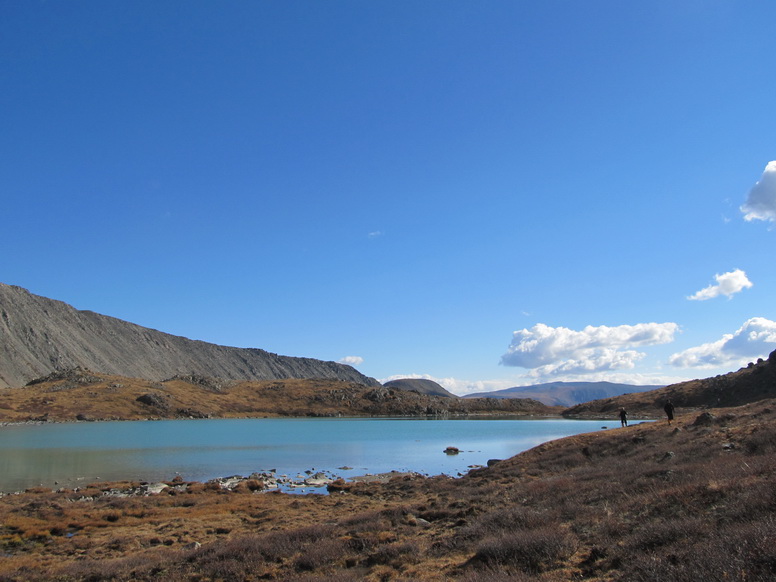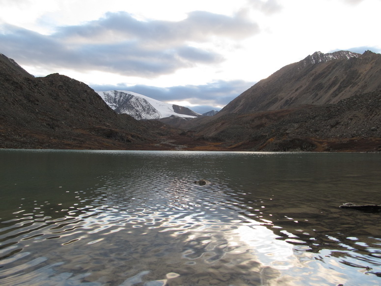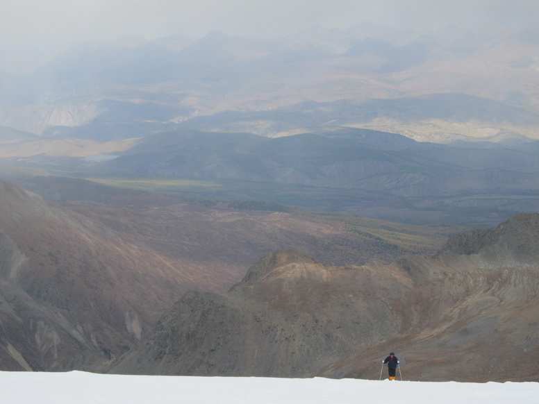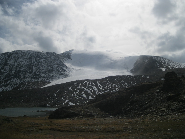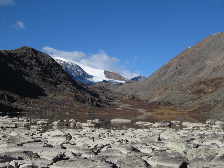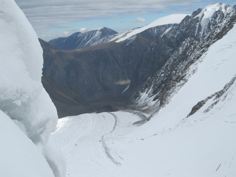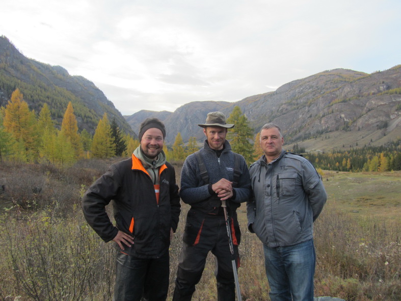 То, где мы шли, называется Курайская степь. По ту сторону Чуйского тракта, куда мы не шли, поднимались безлесные горы. Сверху, и в своих морщинах, и в кулуарах они были припорошены снежком. С нашей стороны, куда мы шли, громоздились горы по значительнее, с ледниками. Ледники белоснежные с голубым отливом на затененных сторонах. Перед горами предстал ковер из сливающейся воедино оранжево-желтой увядающей хвои листвениц. Сочетание этих лиственниц в пору золотой осени со снегом, камнем и насыщено-голубым небом видел я, пожалуй, только лишь единожды - в Магаданской области. Красива необычайно осень и в лесотундре Кольского полуострова, но там она своя, другая – совсем не такая как здесь.