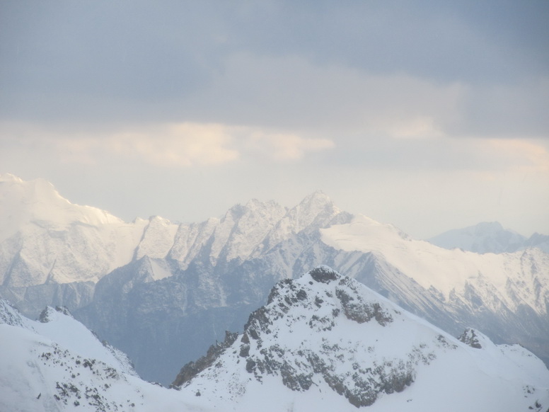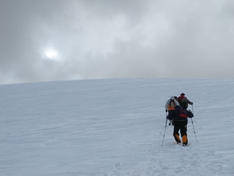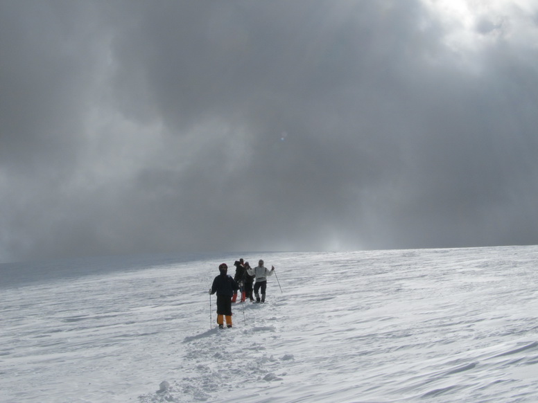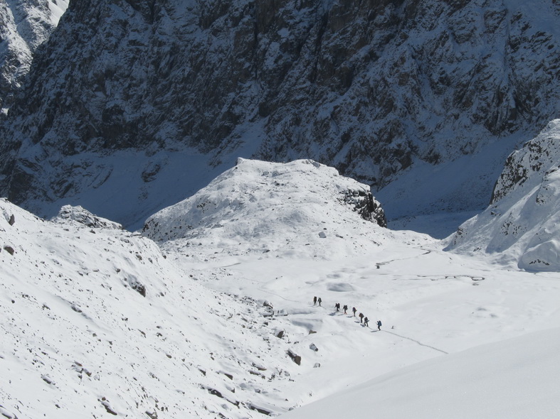 Установилась солнечная безветренная погода. Мы шли вниз. Свежего снега после вчерашнего снегопада стало еще больше, идти сделалось еще более скользко. Только пейзажи стали еще красочнее и просились в кадр. Настроение в коллективе было, кстати, почти приподнятое.