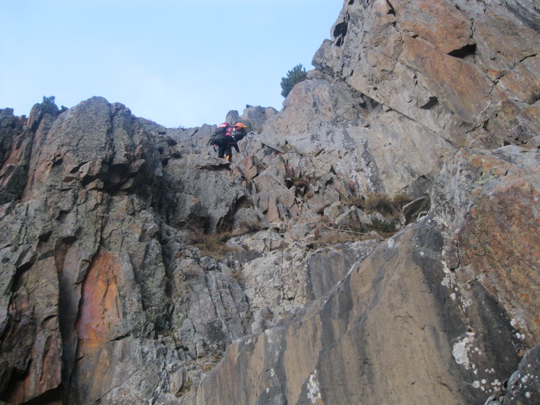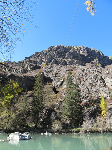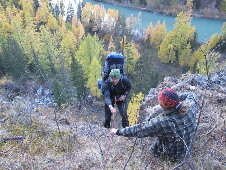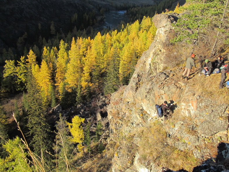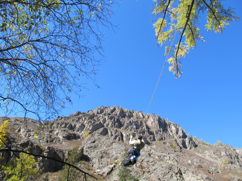 Спускались к Чуе круто. Сразу свободно, ниже через какие-то терни жимолости по каменному кулуару, который привел нас на освещаемую вечерним солнцем скальную терассу. Терасса обрывалась вниз сбросами. Уже совсем рядом была голубая в теснине текущая Чуя. Одели обвязки и произвели спуск дюльферным способом, причем довольно дружно. Если надо подниматься круто или спускаться, тоже круто, получается хорошо и для одиннадцати человек не скажешь, что медленно. Если равнина или просто плоско, каждая развилка дорог и каждый привал нас разваливали на истерящие составляющие.