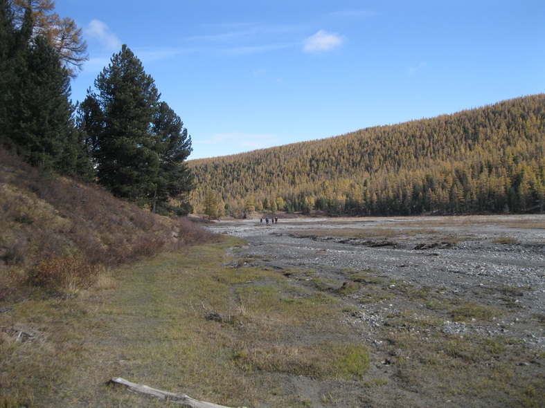 Ходовой день вышел от штатного половинный по ходовому времени и по пройденному пути. Долина Актру расширилась. Русло теперь осенью проходило тонкой лентой по обширному плоскому галечнику. Местами лежал топляк. Его и использовали на дрова. Попробовали разжиться подножным кормом. Такового не имелось. Кедровые шишки пустые, Грибов нет совсем. Из ягод немного совсем не делающей погоду брусники.