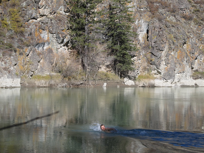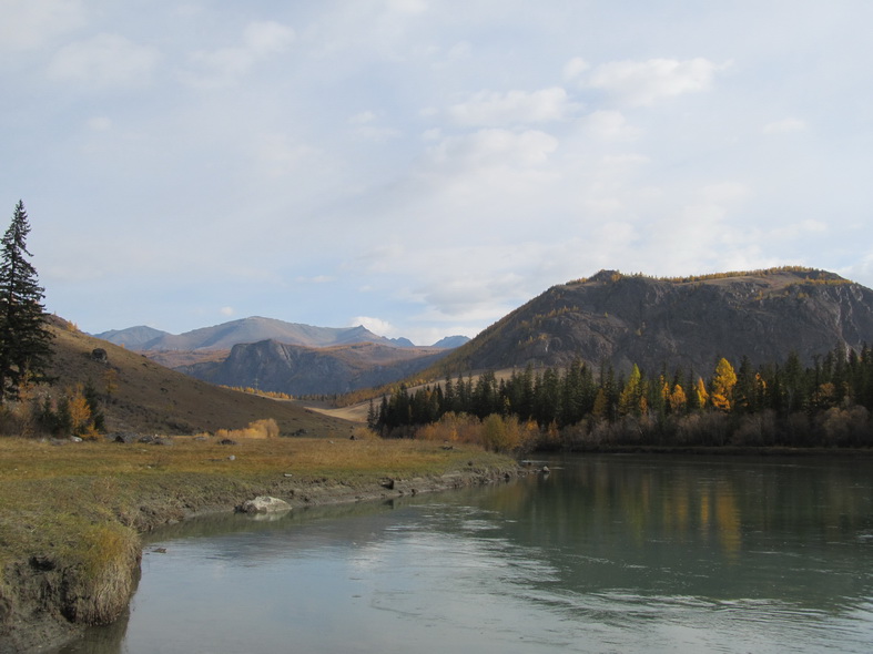 Переправа прошла удовлетворительно. Такеллаж демонтировали и свернули. Мы шли по высокому правому берегу по заметной тропе. Внизу красиво перекатывалась и вспенивалась на локальных препятсятвиях мутно-бирюзовая Чуя. Через четыре километра вверх по течению вышли из теснин. Были здесь луговины, стояло несколько машин. Рыбаки ловили нахлыстом рыбу. Мы быстро нашли консенсус на счет места и на счет того, что сегодня, пожалуй, можно еще и успеть в водочный магазин. Только он ажно в Акташе. Саша Крученок говорит, что бичи на севере и не в таких местах водку умудряются добыть.