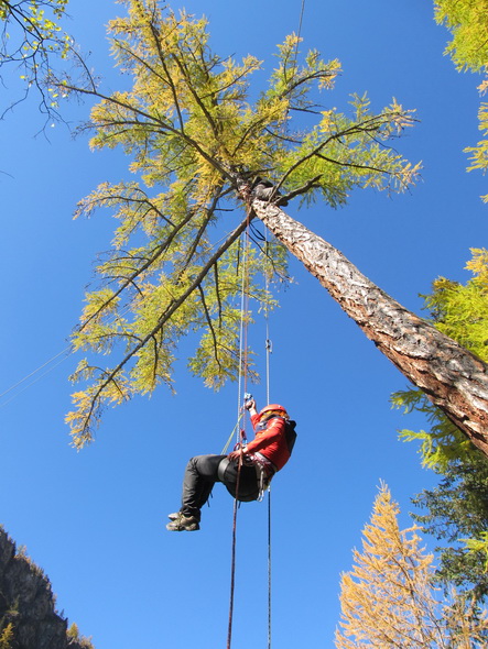 Мы матерились, деловито спорили и в конце концов удалось наладить транспорт рюкзаков – верёвочный лифт. Сидящий на дереве тянет когда за репик к себе, к нему идет поводок с оттяжкой. Ему, значит, это, поднимают через блок рюкзак, вот он его в карабин оттяжки и вщелкивает. Рюкзак дальше по веревке что-то проезжает с уклона сам. Потом его специальные люди дотягивают.