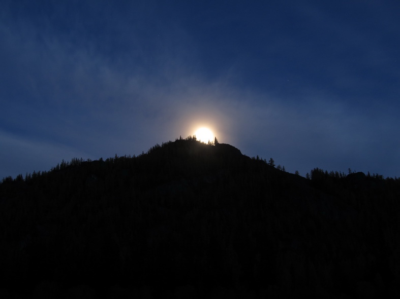 Вернулись в лагерь в сумерках. Горел костер. Аудитория очень обрадовалась покупкам, соскучившись по некоторой еде. Но главное была выпивка. Первые бутылки три ушли минут за десять. Затем уже ютясь к теплому костру из топляка стали вести себя рассудительнее и степеннее. Взошла пополнившаяся до максимума луна. Над зубцами леса выглядела готически.