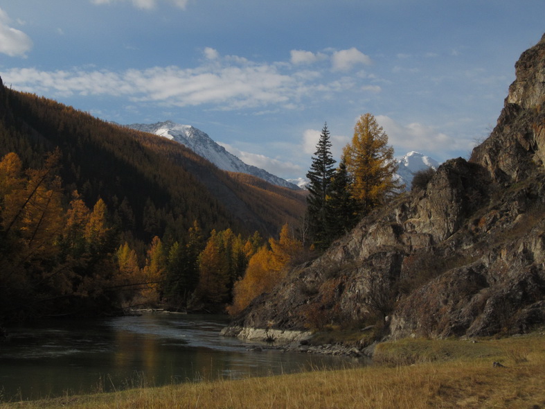 Ночью мороз. Пока не поднялось солнце, было холодно. С его появлением все заискрилось, засверкало. Краски просились на художественные этюды. Это был осенний Алтай с желтыми лиственницами, серой галькой ручья, белоснежными снегами и насыщенно голубым небом.
