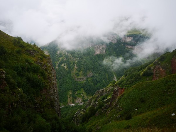 Рассвело. Рассеялся и туман. Мы стояли прямо напротив смотровой площадки, окруженной полукруглой бетонной стеной с панно и металлической балюстрадой. Внизу раскинулось глубокое, живописное и панорамное ущелье.