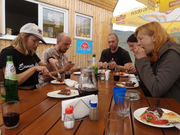 В эйфоричной и праздной обстановке в одной из шашлычных возле смотровой площадки съели шашлык и выпили пять литров Киндзмараули. Столько взяли и с собой. Разошлись в дороге сегодня и следующие пять.