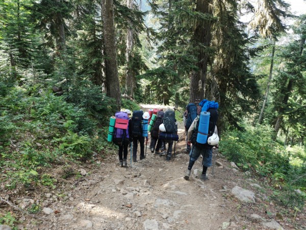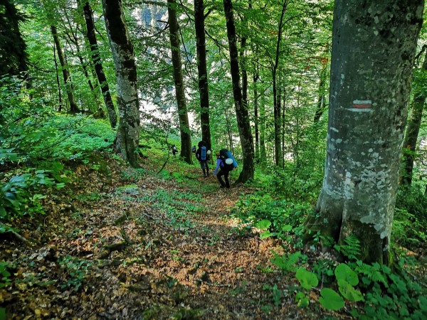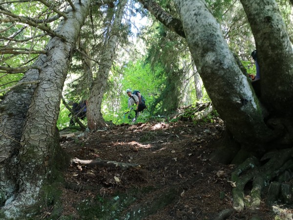 Шли в основном через лес по тропе, иногда спускались по моренным выходам.
