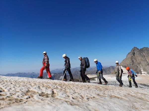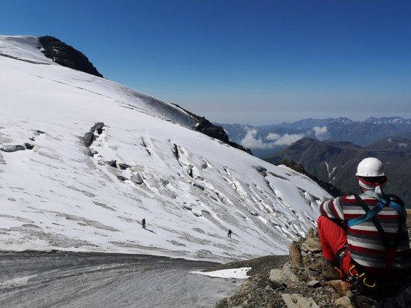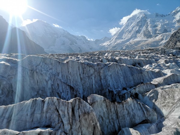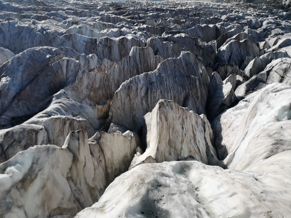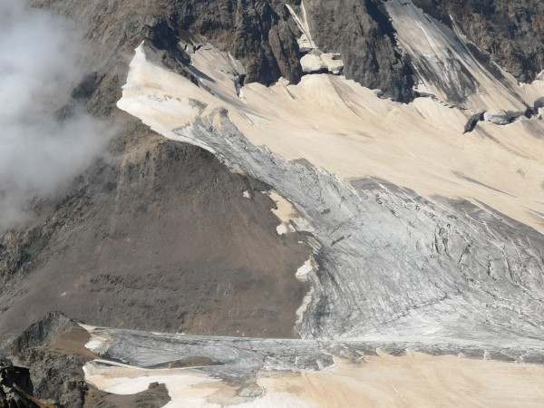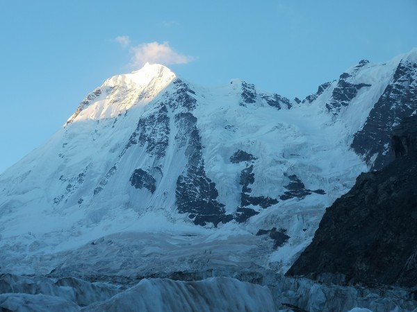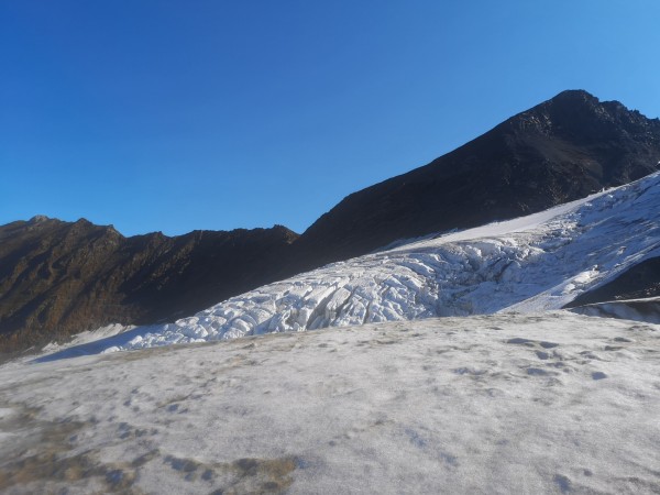 Связались: ледник стал закрытый. Идем. Нервно идем. Ледник дальше страшный. Потому что закрытый. Снежные пробки очень эфемерны, больше бутафорские. Под ними серьезные трещины. Сразу я почувствовал это интуитивно, потом убедился визуально.
