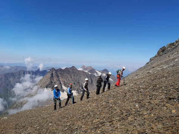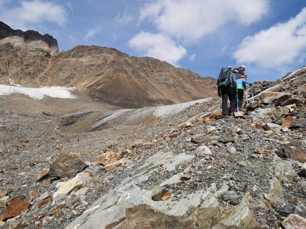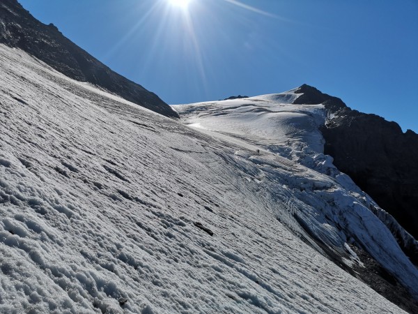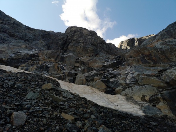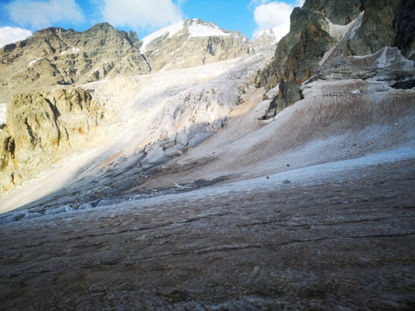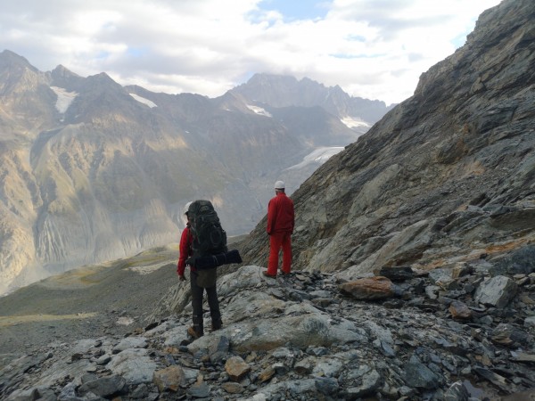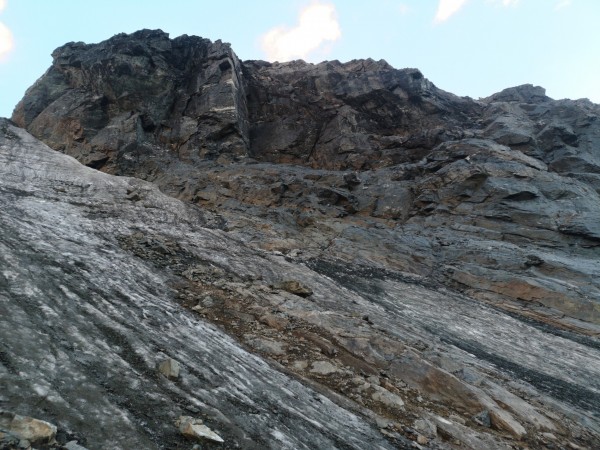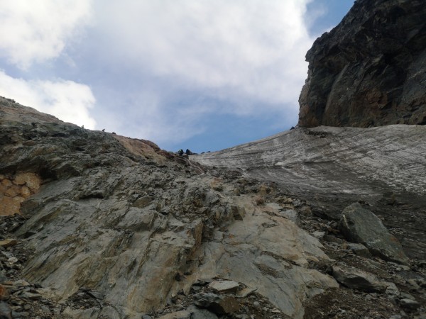 В сыпучем склоне проделаны довольно эфемерные следы, а склон довольно крут.