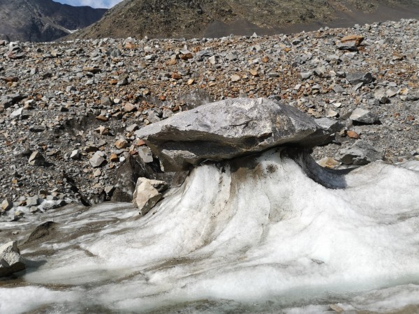 Шли мы по пологому леднику. Он был присыпан каменной крошкой и оттого не скользкий. Глаз показал аудитории «пьяных ежиков». Это такие своеобразные ледяные грибы, сплошь утыканные мелкими камешками.