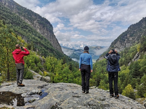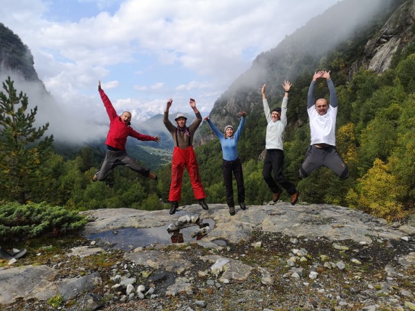 По отдельным турам и ориентировались. Так вышли на старые, перегораживающие ущелье бараньи лбы. Место особенно оригинальное и пейзажистое. Вниз открывается живописная панорама. Ради этого устроили фотосессию. Как индивидуальные кадры, так и групповые. Глаз придумал играть в игру «Великан Сергей». Он практикует фотографии именно когда группа в прыжке.