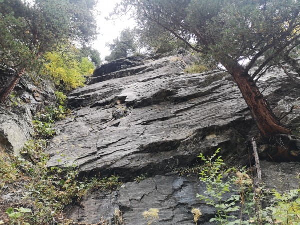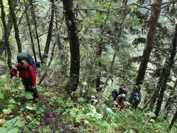 Потом, как и вчера, траверсировали неприятный конгломератный склон. Ступени проделывали лопатками ледорубов. Какой-то здесь след был, но совсем ненадежный. Складки конгломератного склона и мы, наконец, в березовом лесу с рододендроновым подлеском. Хоть сентябрь и здесь выше, чем на равнине, но осень досюда еще не добралась. Листва зеленая. Но чувствовалось преддверие. Нашли даже и грибы, но варить их не стали. Глаз сегодня, кстати, дежурный.