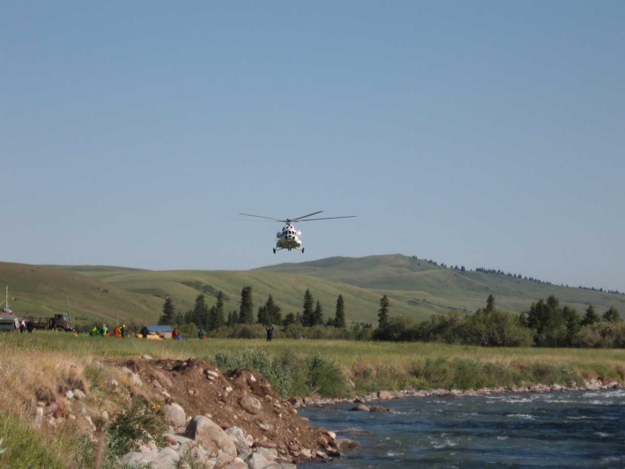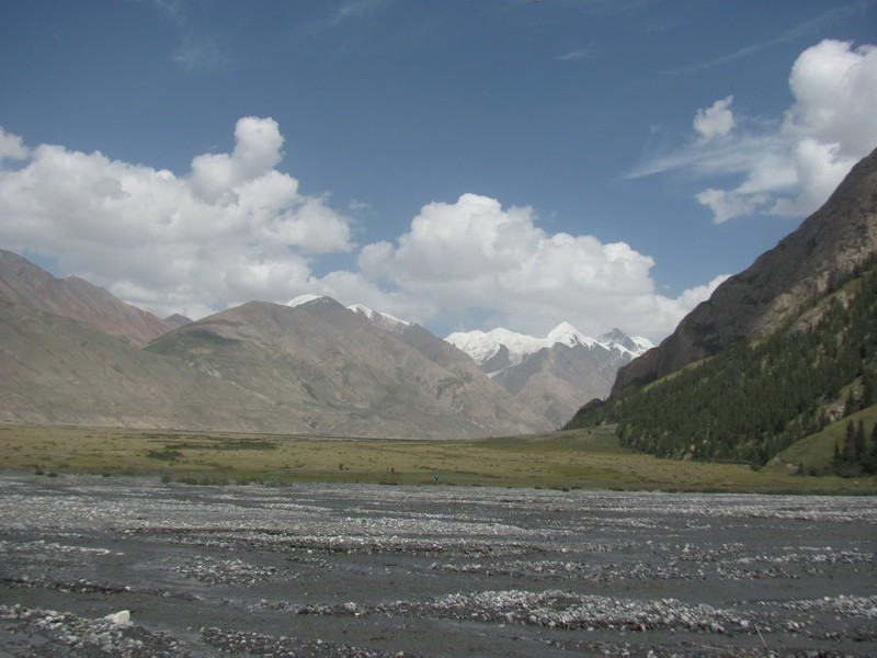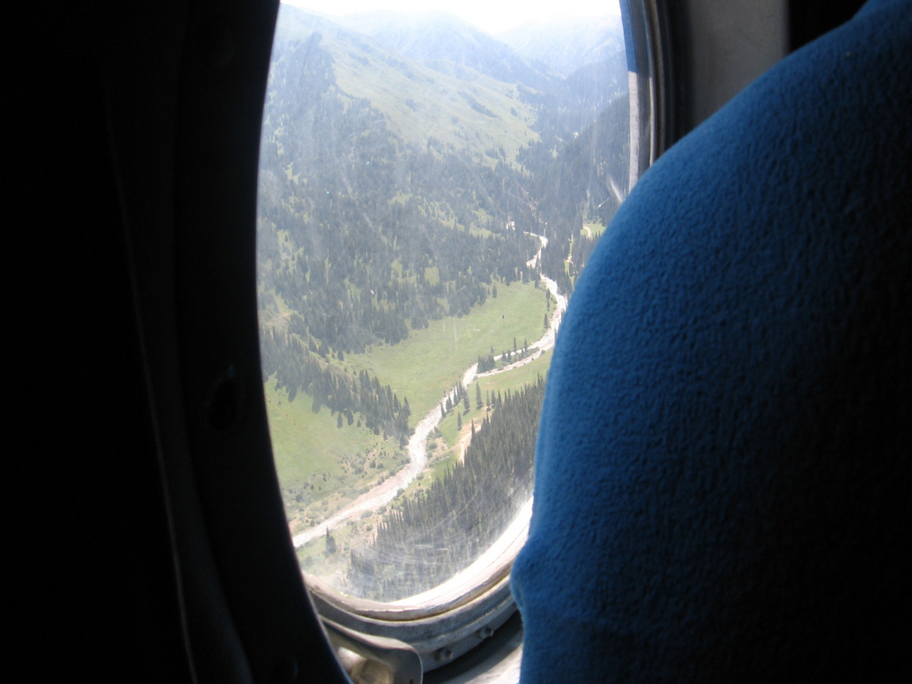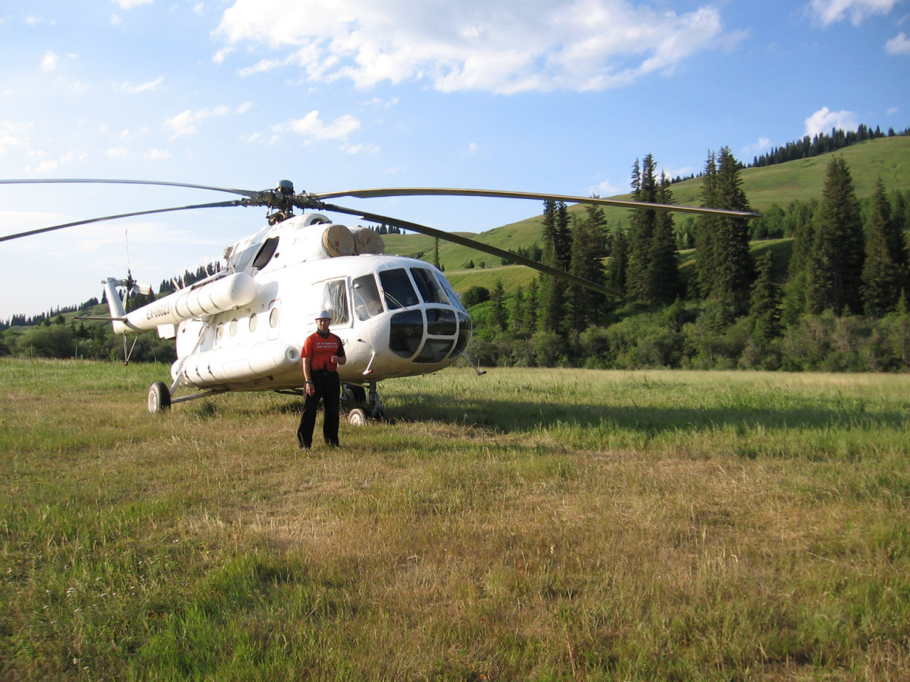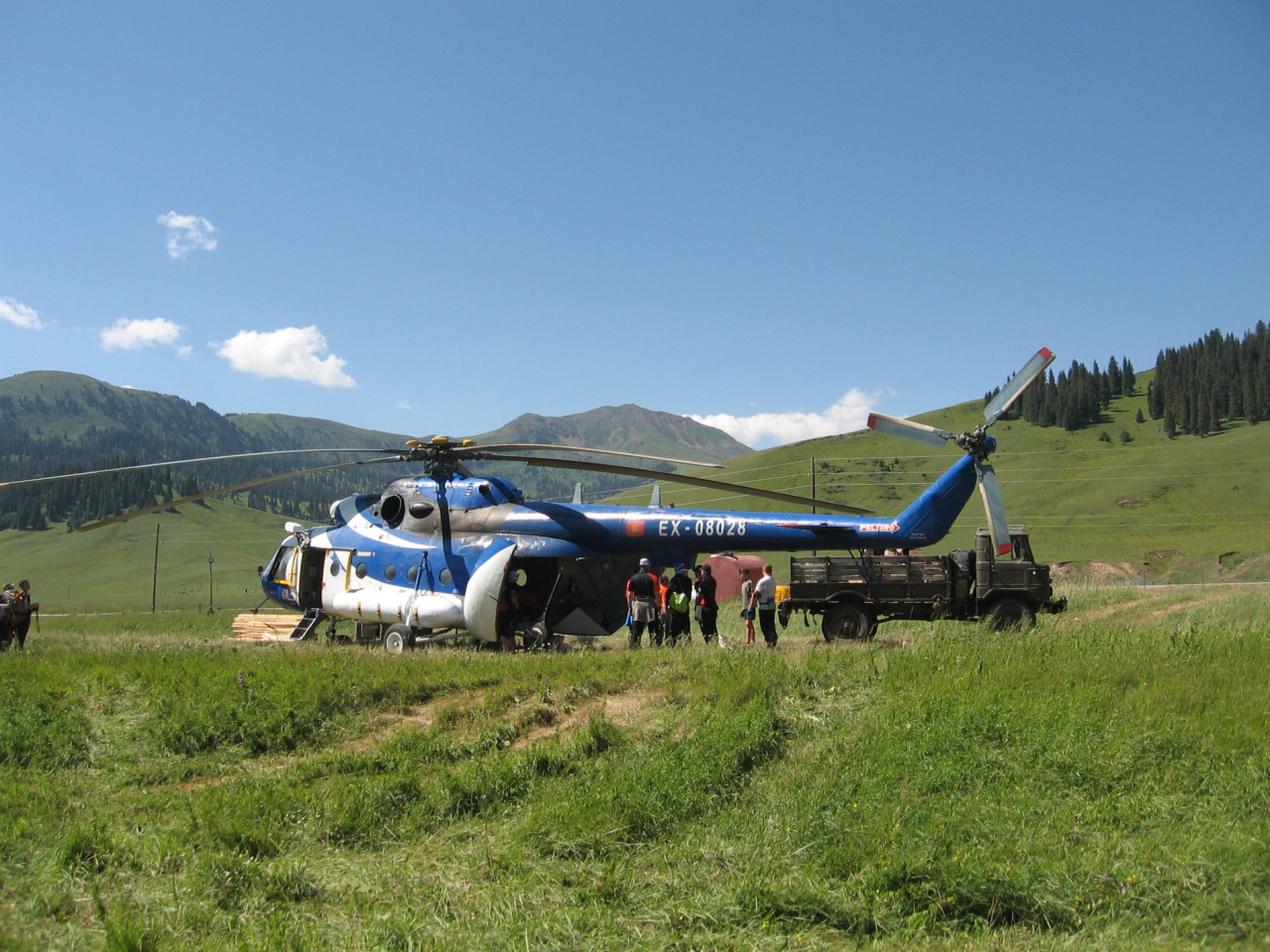 В Каркару съехать нужно от Каракола 20км в сторону. Это ветренное неуютное место. Глиняные дома и пасущийся скот. Строения «Аксай-тревела», два ряда цилиндрических палаток. Чуть поодаль вертолет Ми 8 с грузно свисающими лопастями. Возле лагеря река. За ней сразу граница с Казахстаном. На той стороне на зеленых буграх тоже есть подобный лагерь, казахский. Там, кажется, вертолета нет, но его арендуют в Аксай-тревел. Аксай-тревел тоже арендовали раньше вертолет. Теперь его или купили прямо перед нашим приездом или во время нашего приезда.