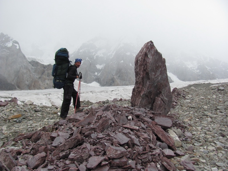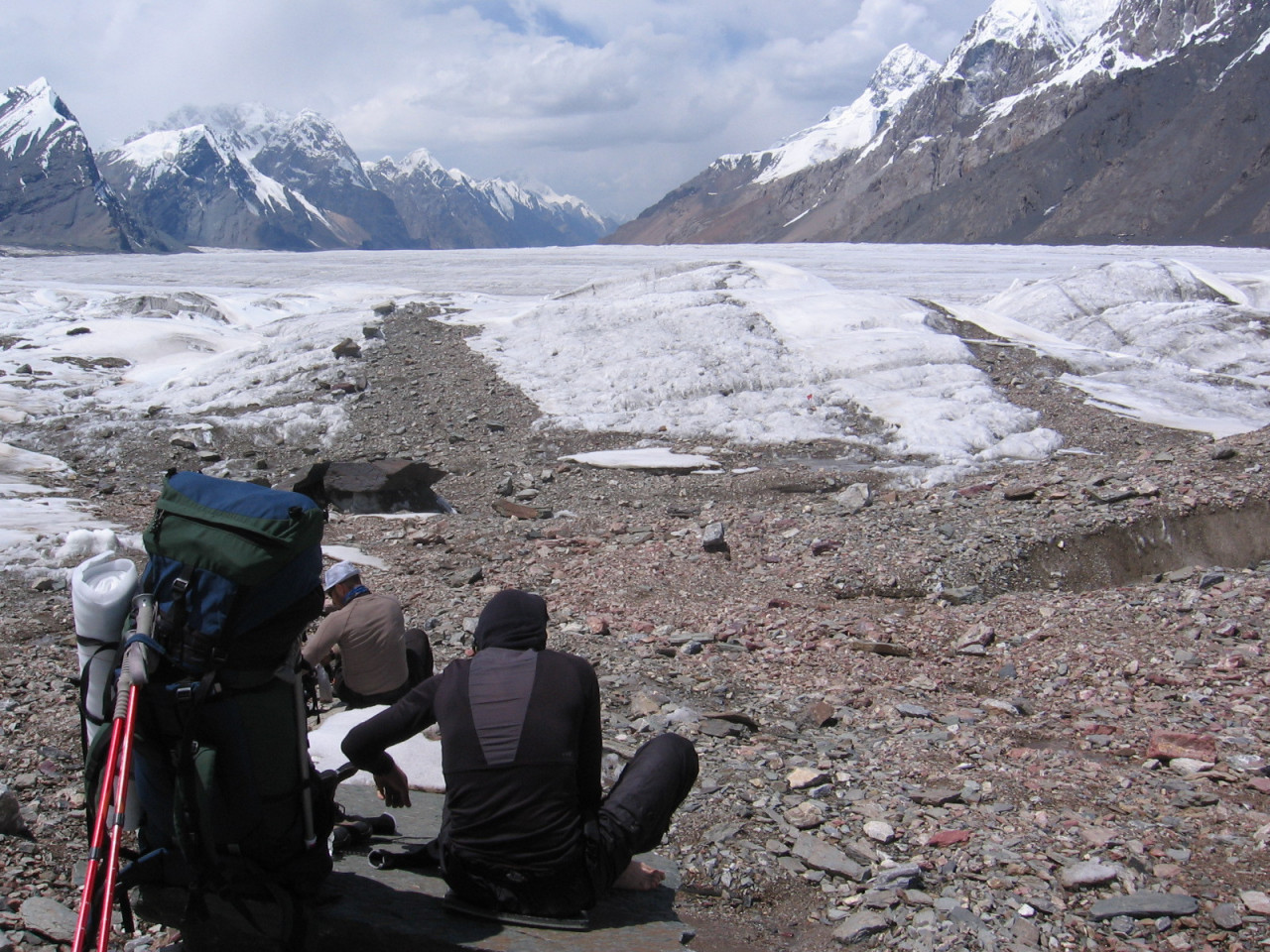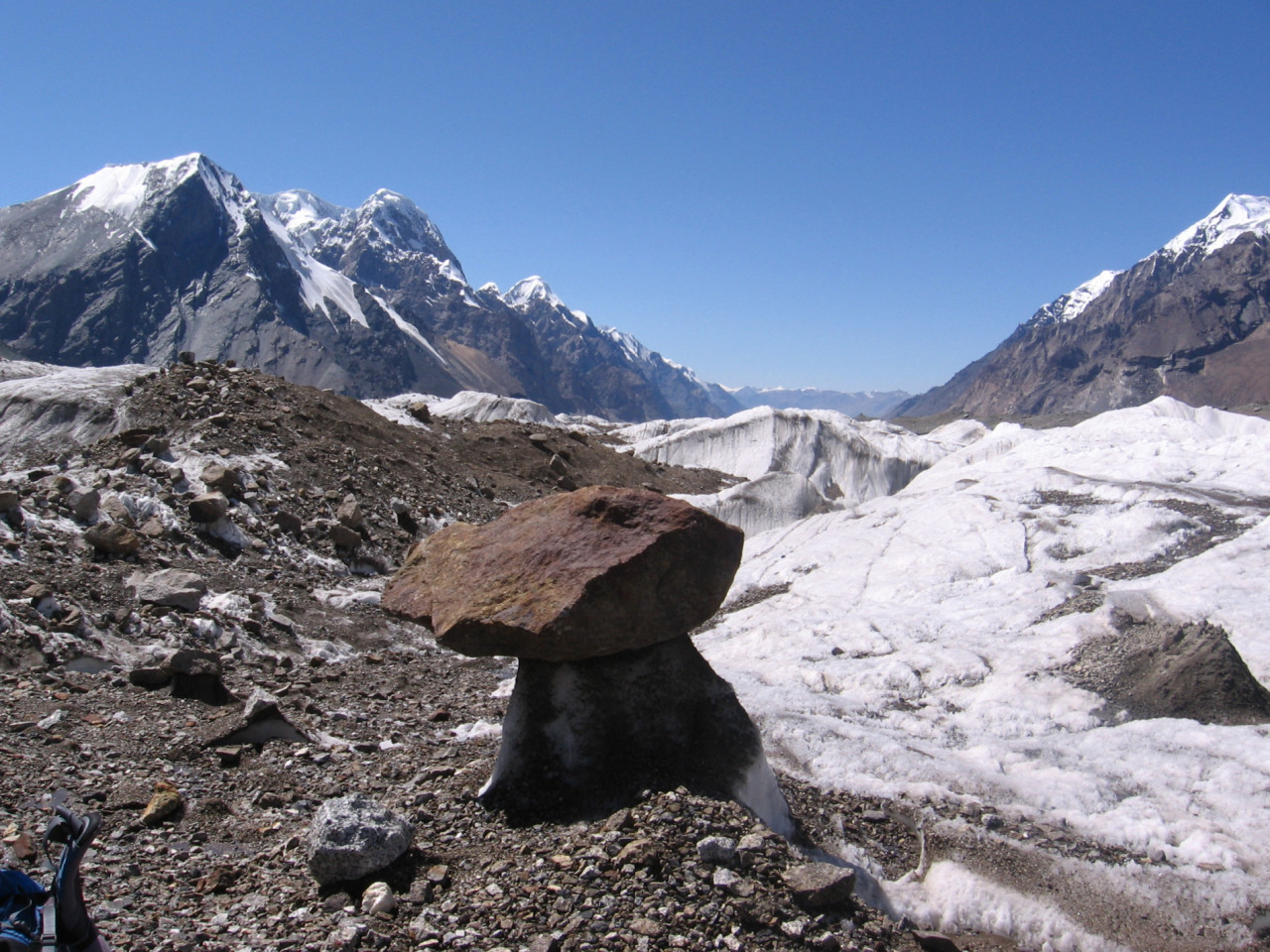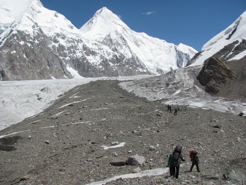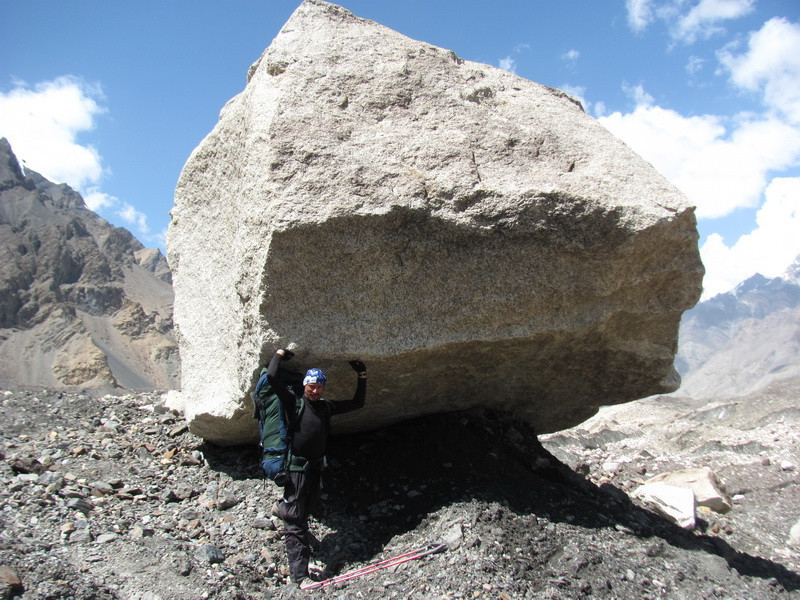 Ледник чем ниже, тем становился более зачехленным моренными нагромождениями. Шли по часу пятнадцать, отдыхали полчаса. Путь был не то что сложный, но довольно унылый. Как-то весело и беспечно вынырнул из-за правого хребта долины вертолет, снизился и невысоко прошел нам навстречу. Мы заканчиваем наше путешествие. А там, скорее всего, свеженькие туристы еще и не акклиматизированные.