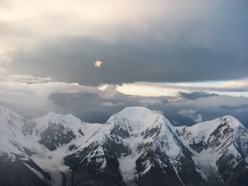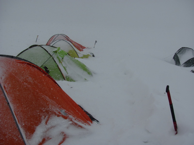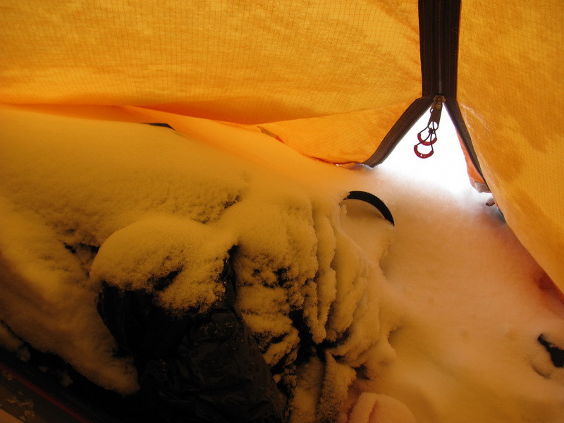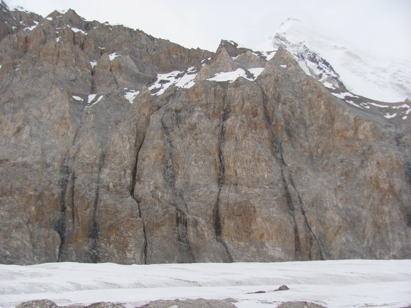 Суров оказался Тянь-Шань по сравнению с некоторыми другими летними регионами, где мне доводилось быть. Первые две трети похода ходили скорее «в окна». Сыпало, мело и дуло большую часть времени. День или ночь начиналась, если и с хорошей или сносной погоды, всё завершалось непременно какими-то потрясениями. Контрасты между жарой с раскисанием снега на леднике, подлипом, обгоранием на солнце и холодом с морозом здесь очень резкие.