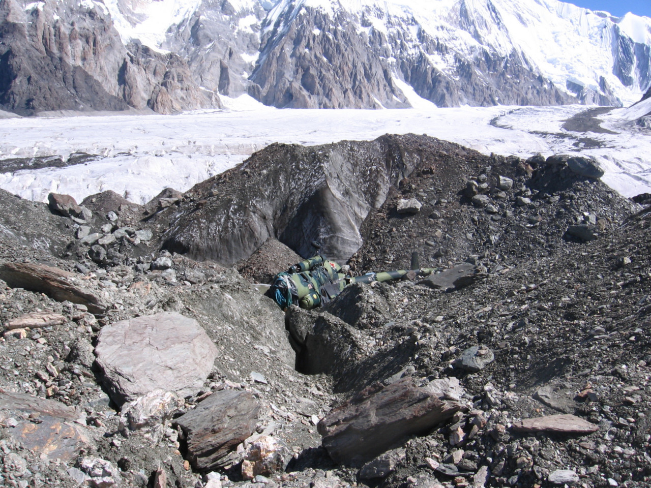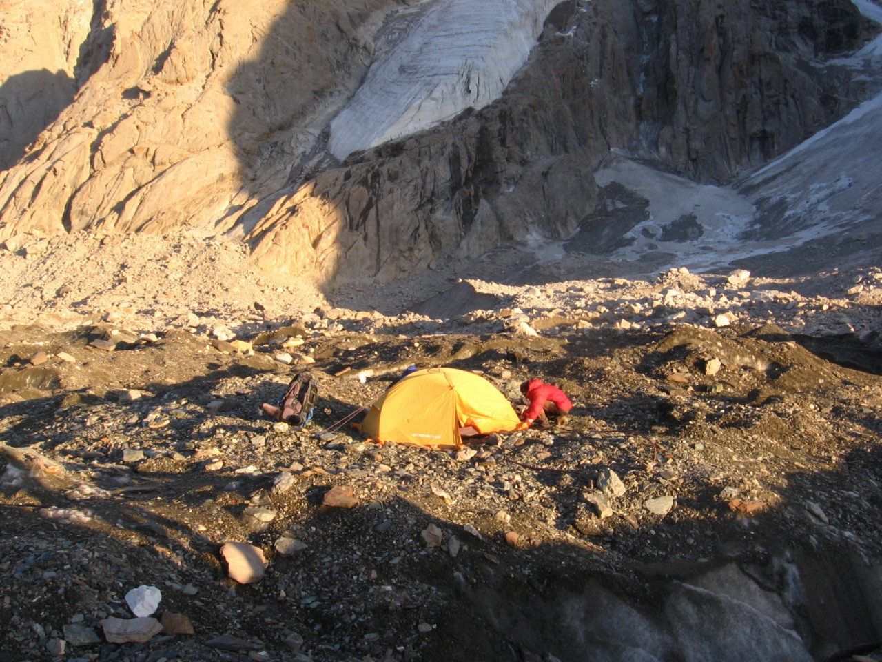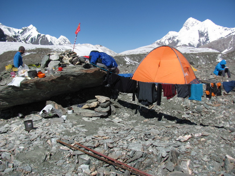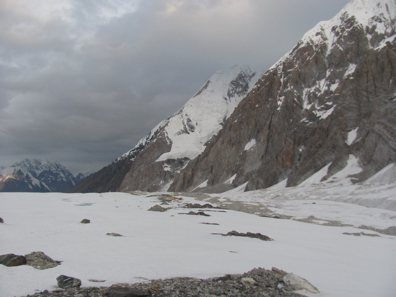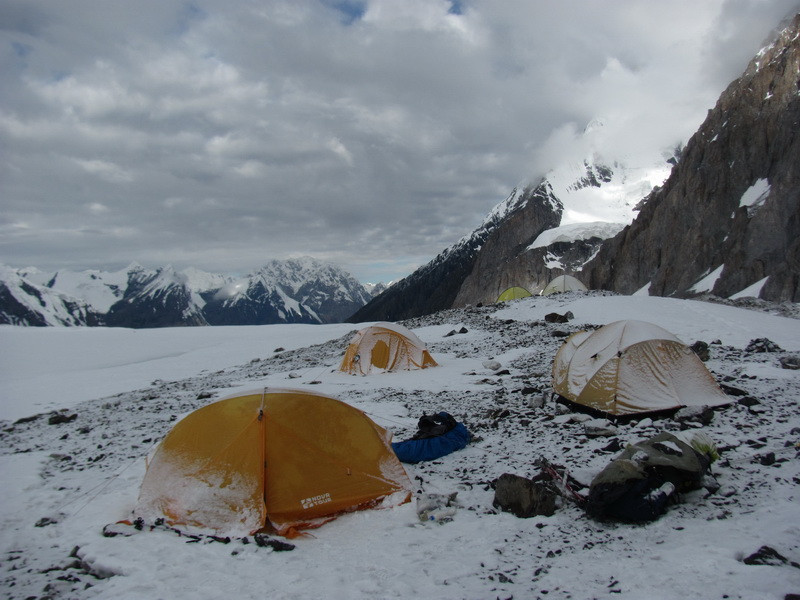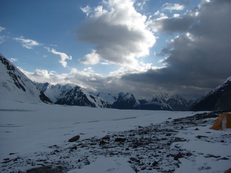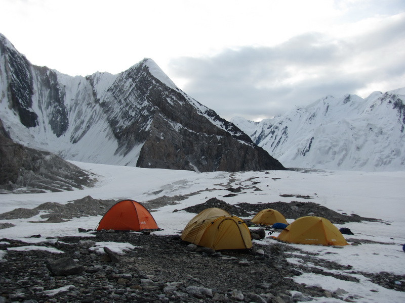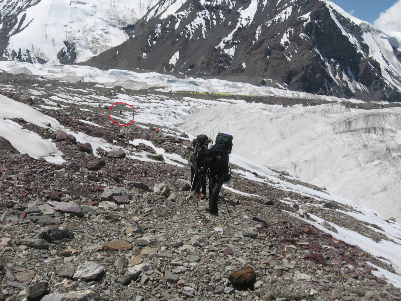 За перегибами складок ледника, чуть ниже мы увидели лагерь «Комсомолец». Примерно десятая часть от палаток, что в базовом Южном Инылчеке. Было малолюдно. С нами приходили общаться несколько портеров - молодые люди (большая часть национального вида). Пришел довольный Аркадий и сообщил, что можно купить бутылку водки. Цены во всех лагерях одинаковые – 10 долларов за пол литра. Глаза это устраивало. Машу отправили за бутылкой.
