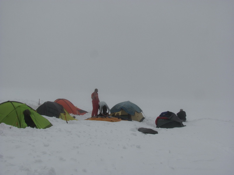 Поляна Мерцбахера действительно поляна в виде лужайки. Травы мы не видели почти месяц. Здесь же среди ледника это был так необычно. Несколько десятков желтых палаток, установленных в ряд. Конструкции и оборудование метеорологической службы. Несколько бытовок стационарных и толчок, разумеется. Присутствовало здесь несколько работников. Туристов не было. Вместе с тем настолько сегодня было здесь депрессивно, что это трудно даже вообразить. Небо сделалось гнетуще пасмурным. Стало ветрено. От него тряслись стебли травы. Неуютно. Мы залезли в одну из этих необитаемых цилиндрических палаток. Обедали здесь по горячему. У работников как раз купили хлеба, и на вечер Глаз приобрел бутылку водки.