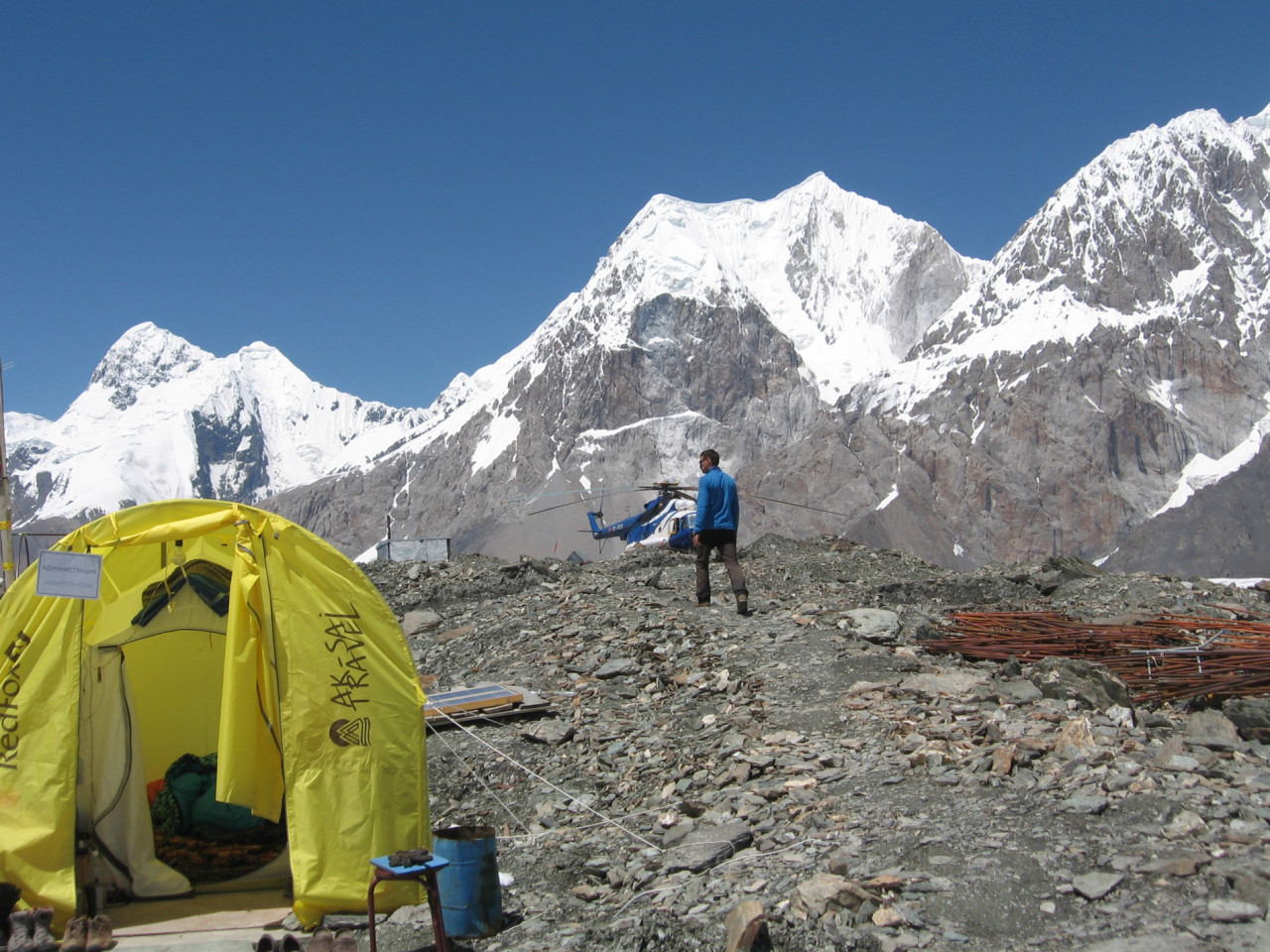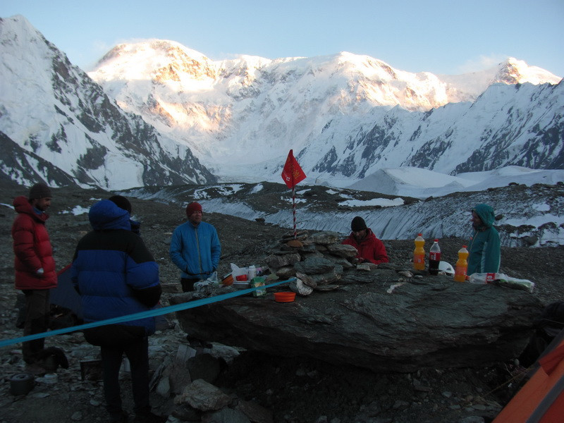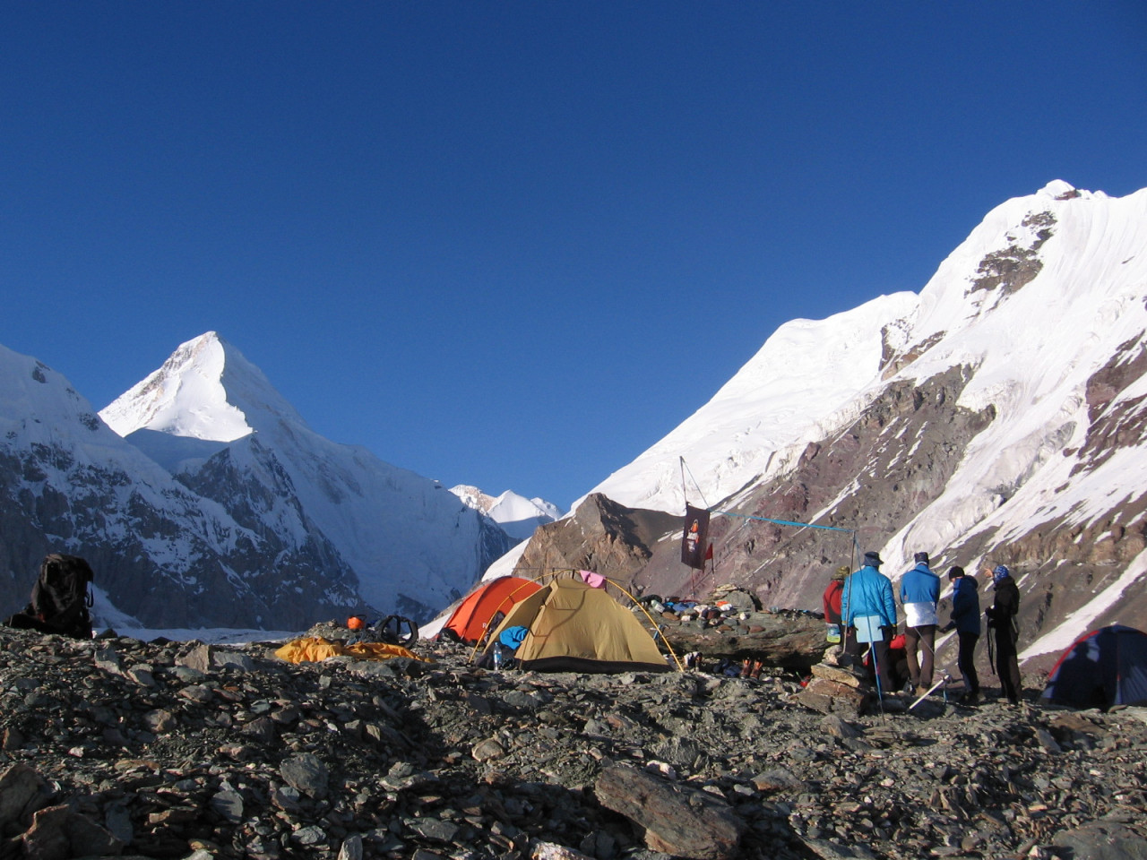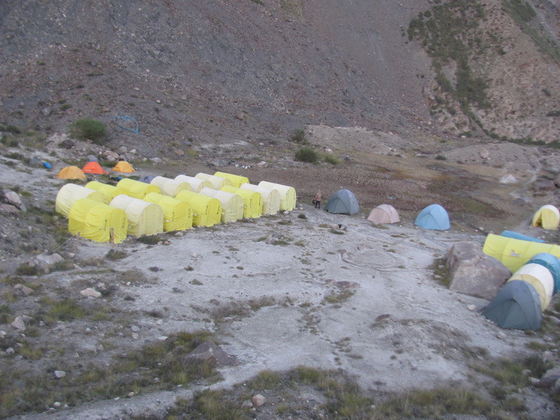 Социальная обстановка в базовом лагере благоприятная. На эти вершины ходят мотивированные люди. Встречаются в подавляющем большинстве профессионалы с хорошим снаряжением и очень дорогой одеждой, палатками и аксессуарами. Гопники не встречаются. На удивление много мусульман. Турки, иранцы. Ходят дружно. Богослужений я не видел. Когда лепят в лагере свои палатки рядом, ощущаешь себя в центре восточного базара. Но рано еще до захода солнца затихают. Маршруты коммерцизованны в приемлемой степени. Нам не пакетным участникам (пользовались услугами только вертолета) было комфортно. Зачастую не пренебрегали мы благами базового лагеря и за сносную цену добывали дополнительные съестные припасы. Коньяк, газированные воды, овощи.
