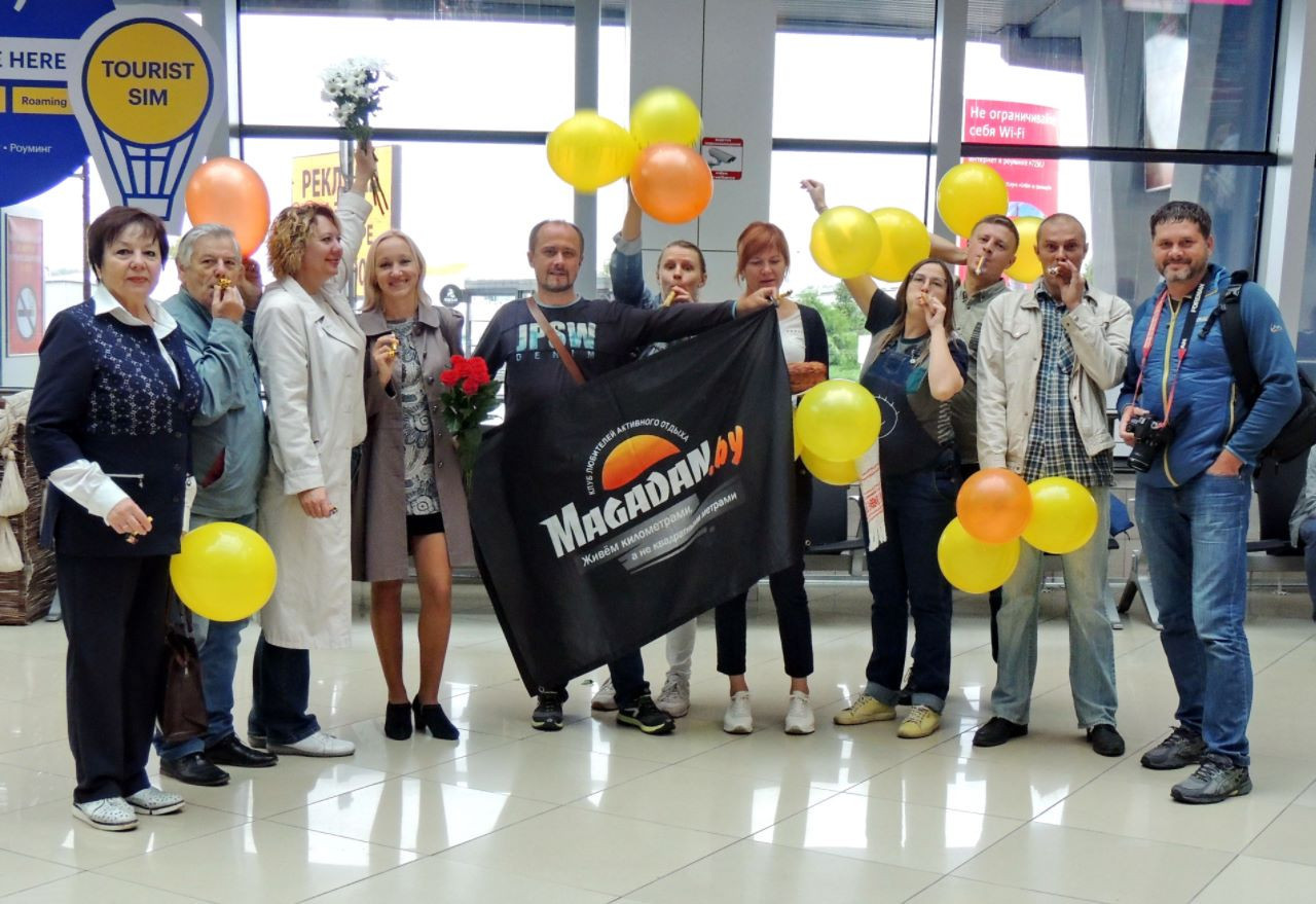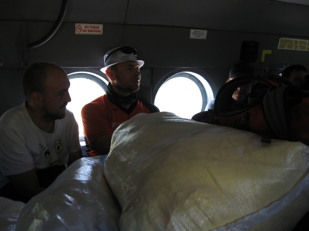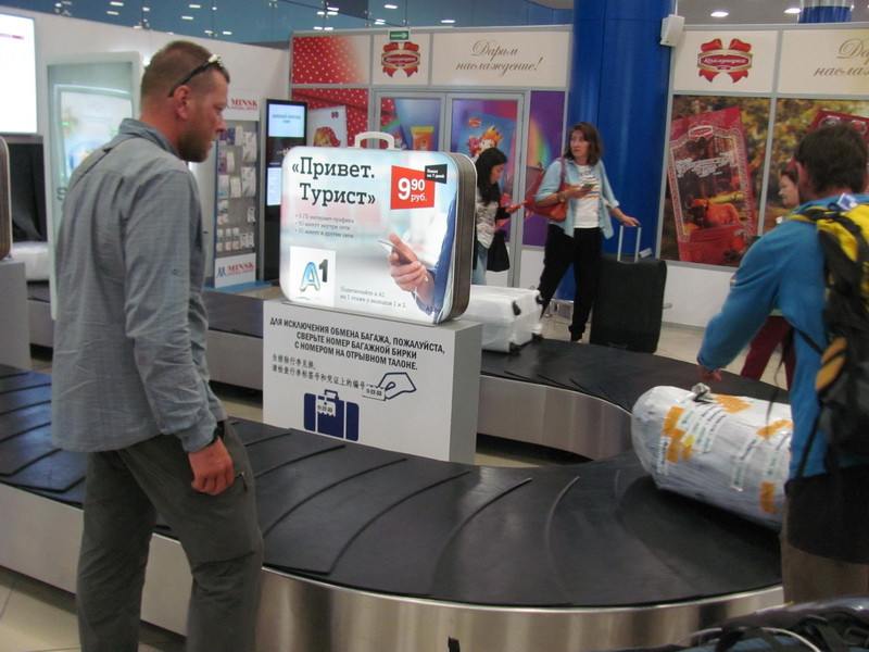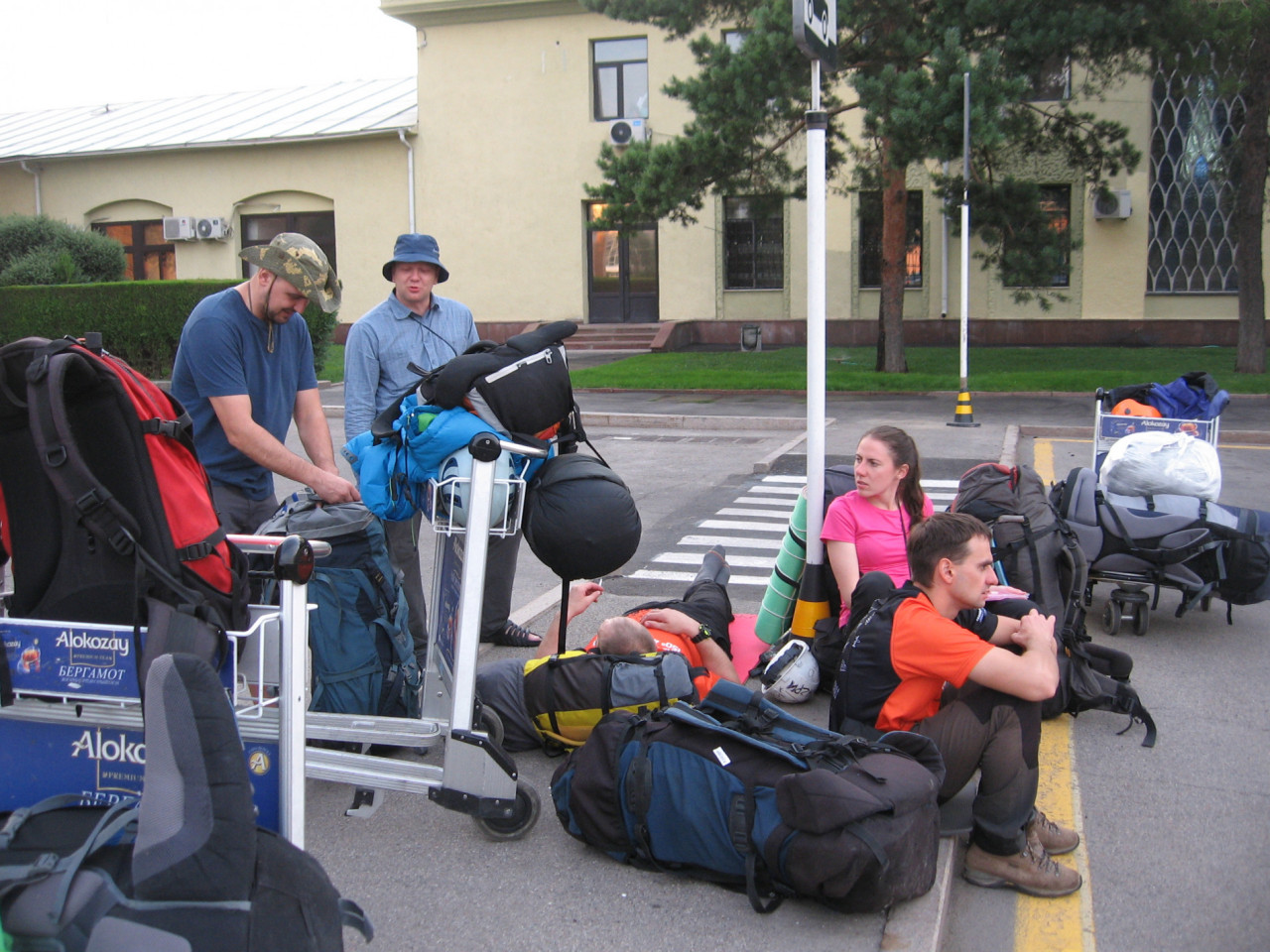 Вещей у нас было много. И возили их на прикольных тележках. Только один запас еды на 30 дней у каждого весил около 17килограммов. Паковали и перепаковывали рюкзаки. Они должны были весить не более 23 килограммов. По итогу получилось кроме них 3 огромных баула с дополнительным багажом. Когда стояли в очереди на регистрацию, откуда ни возьмись, появились Миша Миндибеков, Миша Ухват и Игорь-Капризка. Все в модных летних рубашках. Естественно, провожать прибыли с алкогольными напитками, предварительно циничным образом замаскированными под безобидную продукцию. Глаз тут же удалился с ними на белые металлические стульчики: «Присядем на дорожку».
