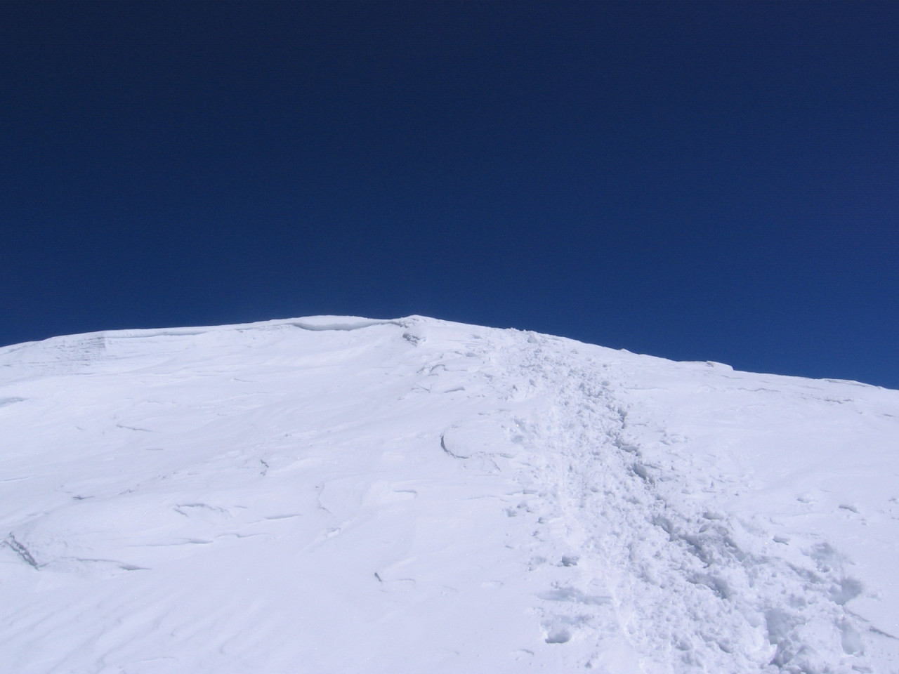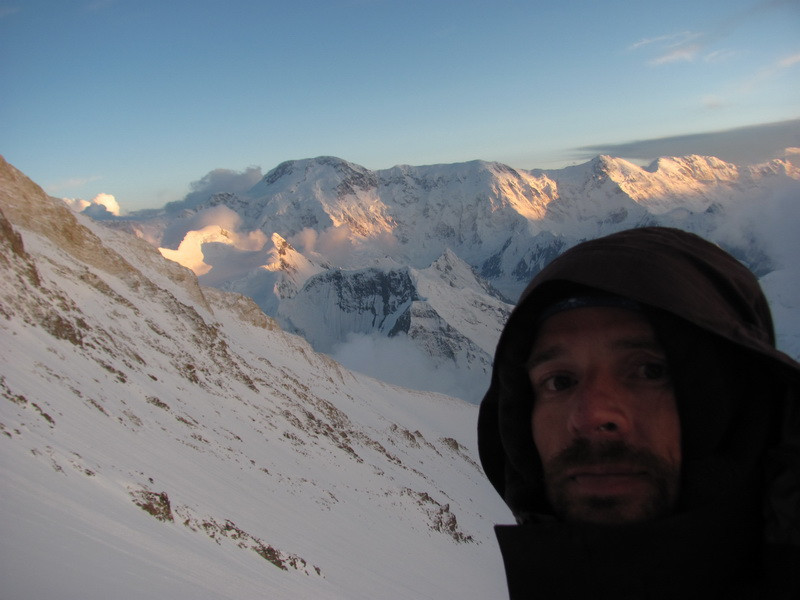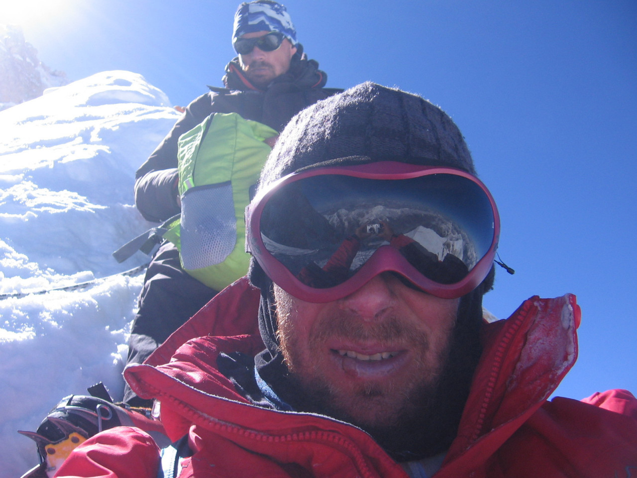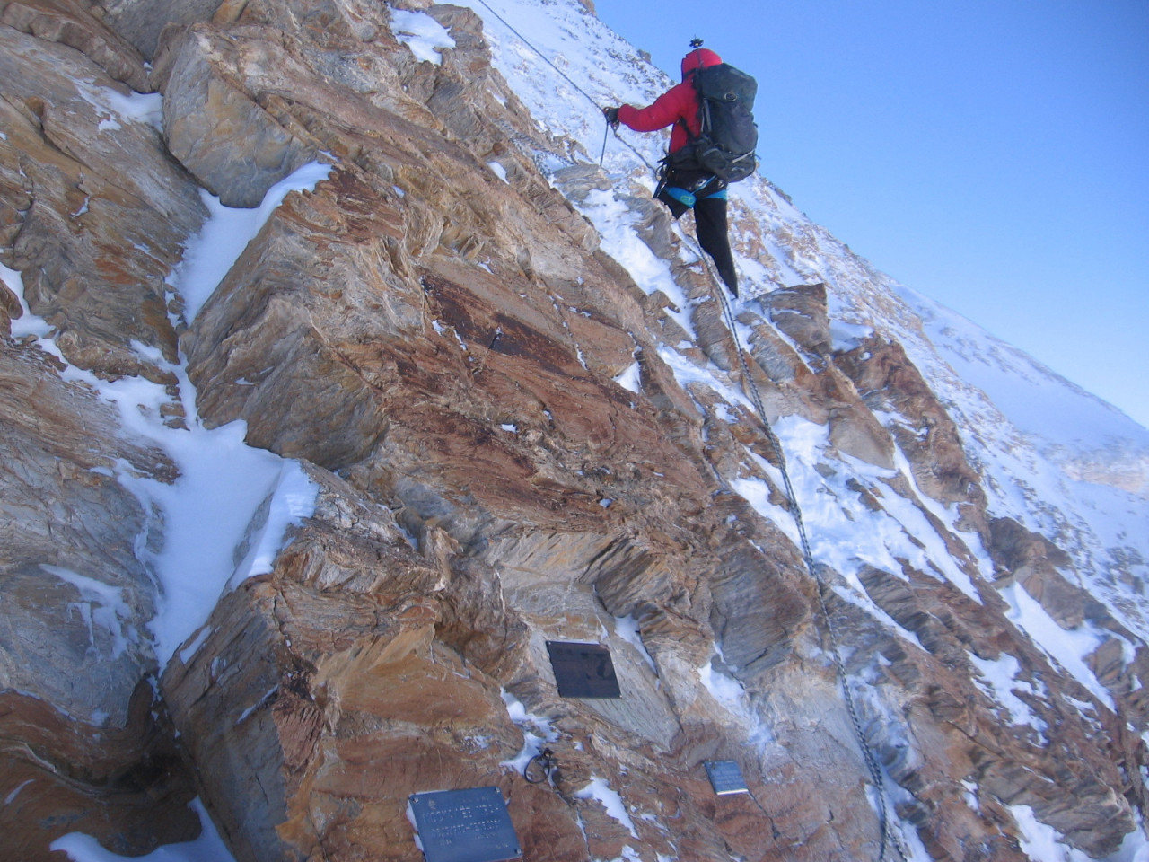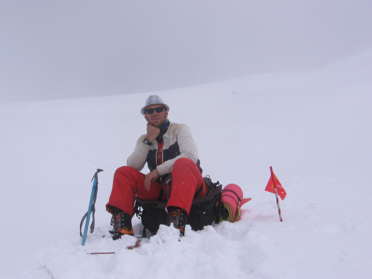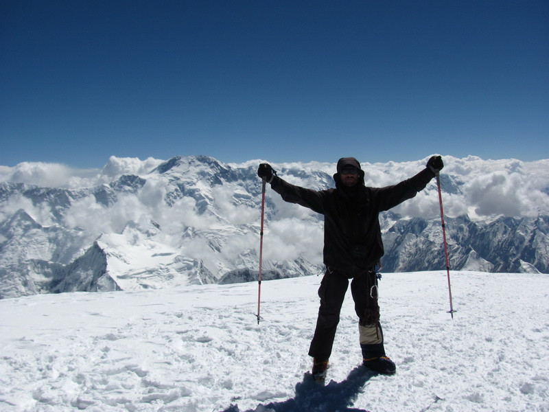 Кульминация маршрута начинается с высоты 6100. Оттуда до вершины идет сплошная нитка перил. После акклиматизации я доходил до 6700 метров (крутой каменистый кулуар перед выходом на снежно-ледовый нож), когда понял, что на этой попытке оставшихся 300 метров не вытягиваю. После дополнительной акклиматизации и отдыха 7 августа, выйдя в 1.14, в 12.50 я был на вершине Хан-Тенгри! Аркадий Иосько спустя 1 час 10 минут.