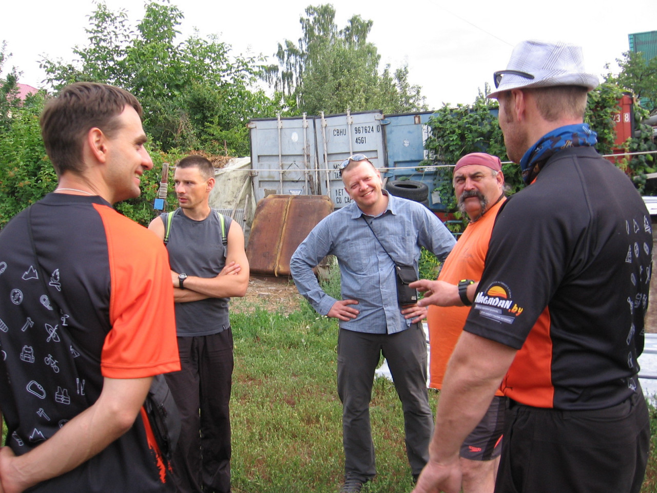 Пошли посоветоваться с Игорем Ханиным – руководитель одной из местных конкурирующих турфирм, заодно и поесть. Шли недалеко. Подворье. ГАЗ 66 канареечного цвета, ласковые два спаниеля. Игорь Ханин пузатый мужик лет 55. Усы заплетены в косички.