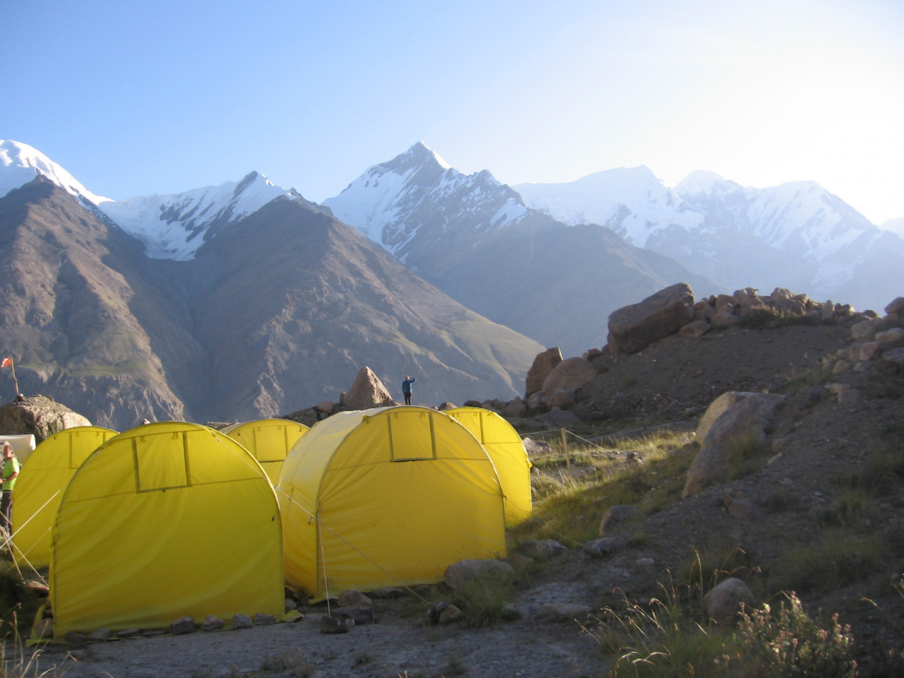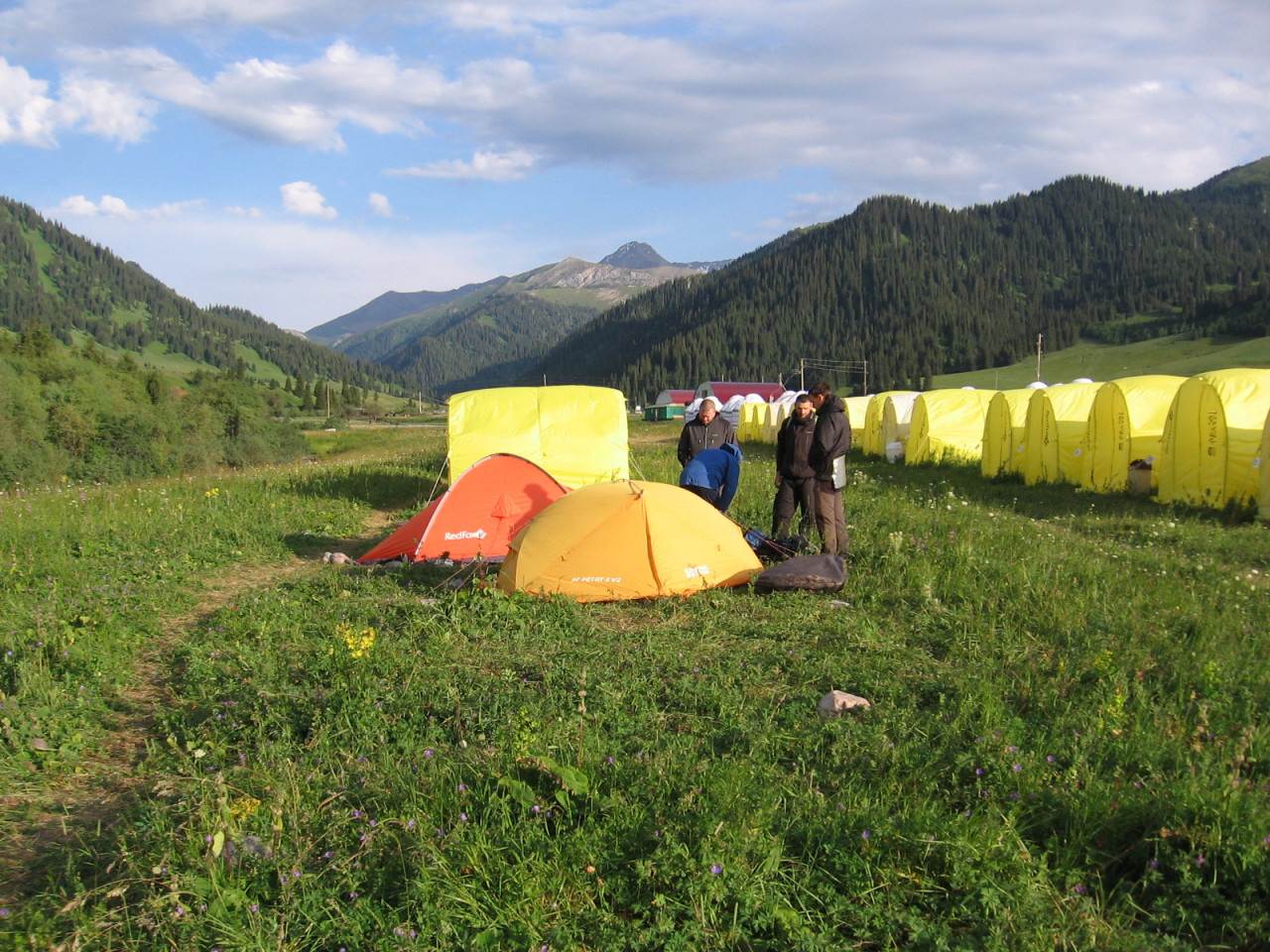 Лагерь Ак-сай Тревел «Каркара» огорожен сеткой от пасущихся животных. Минимум хозяйственных построек. Два ряда цилиндрических кислотно-желтых стационарных палаток. Это для коммерсов. Их еще называют пакетниками. Пакетники источник доходов. Среди не восходителей, а именно горных туристов к ним, коммерсам, относятся с легким скепсисом. В палатках этих ставится деревянный поддон. Укладываются тюфяки. Ребра из капитальных металлических трубок. Так что они не то что ветроустойчивы, почти незыблимы.