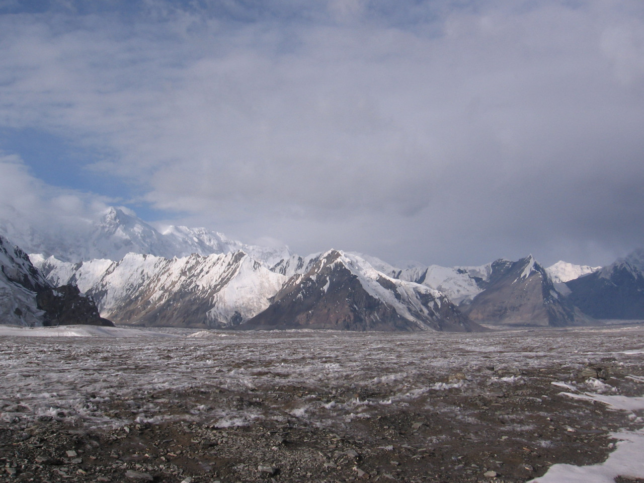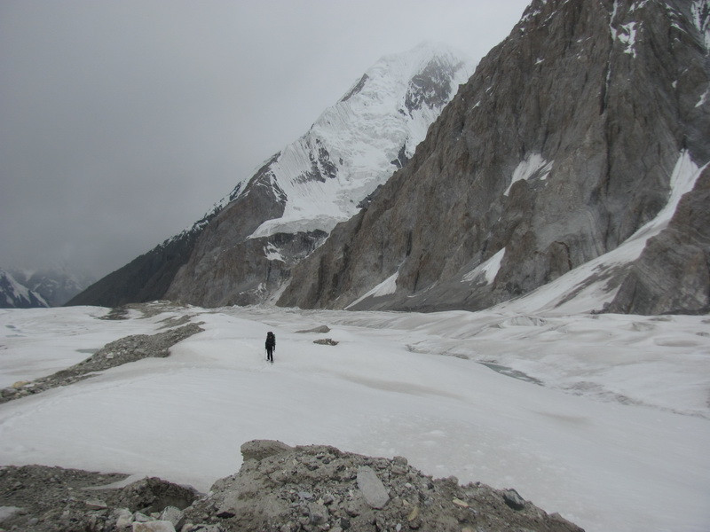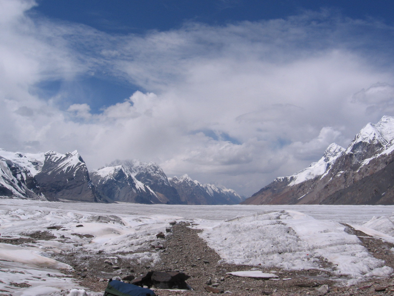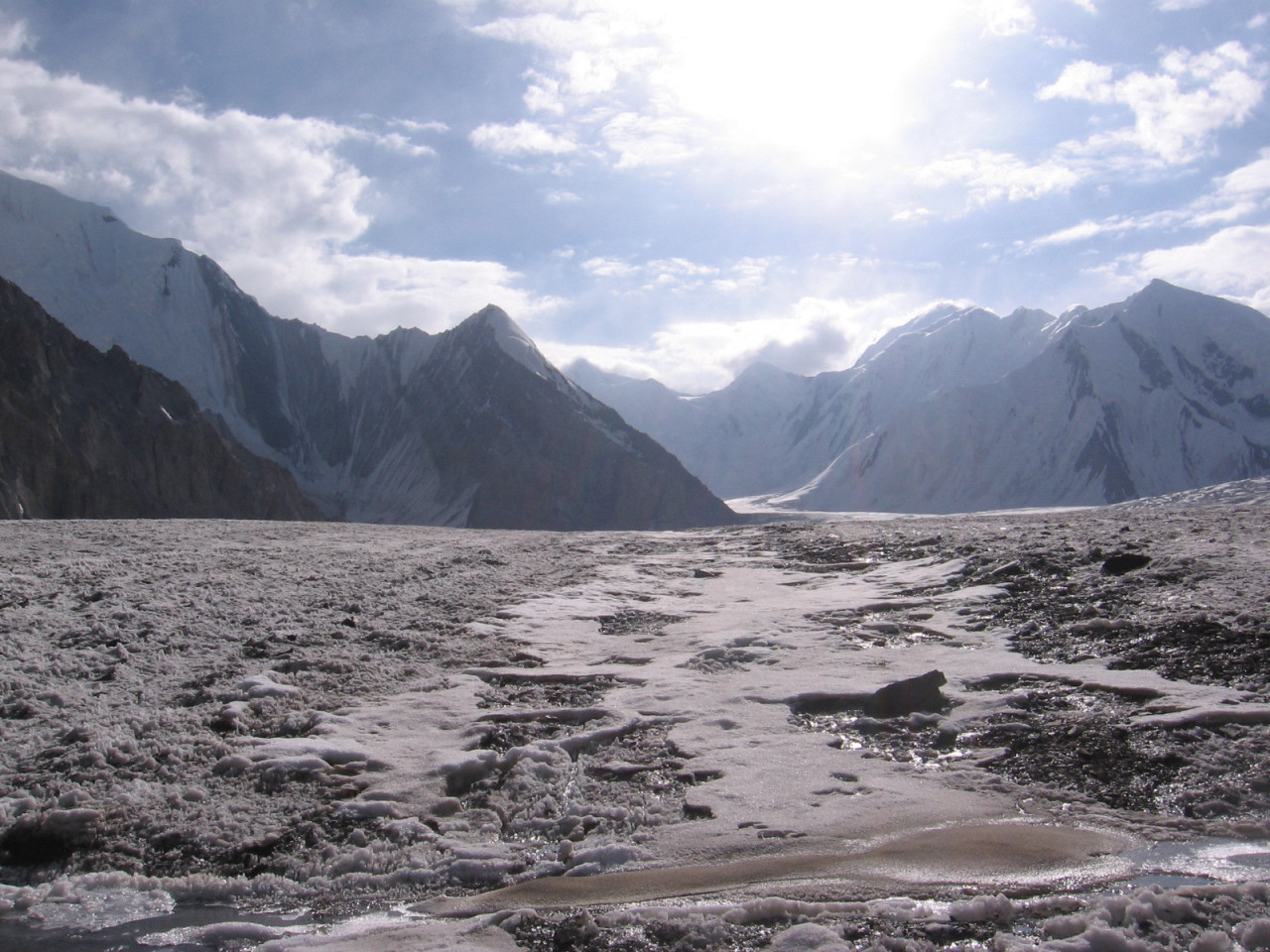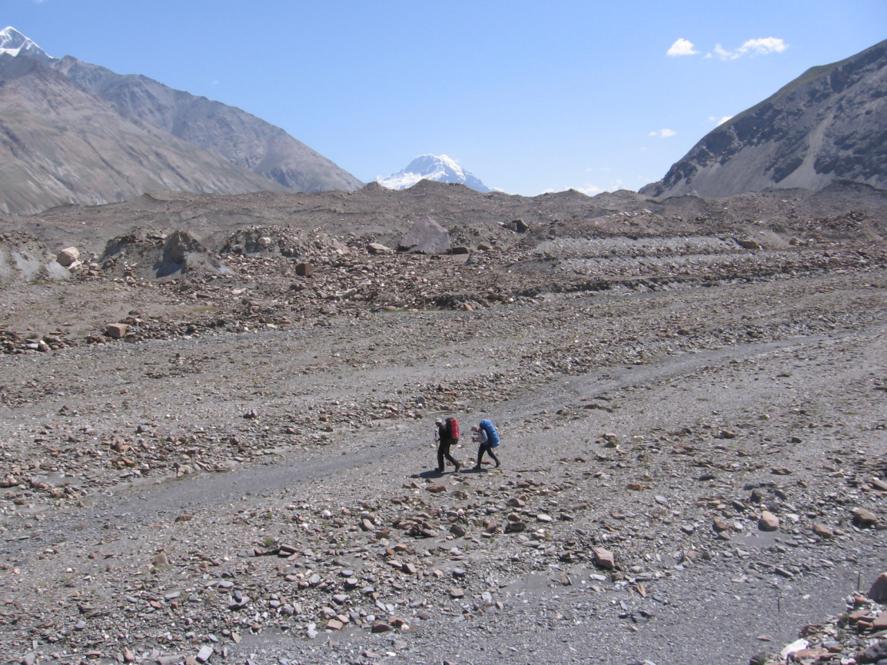 Долина ледника необычайно широка. Его поворот налево был где-то очень далеко и никак не приближался. Шли ближе к левому его борту. Перешли несколько ручьев. Встретили иностранцев, парня с девушкой. Они сообщили, что до лагеря «Глина» идти около часа.