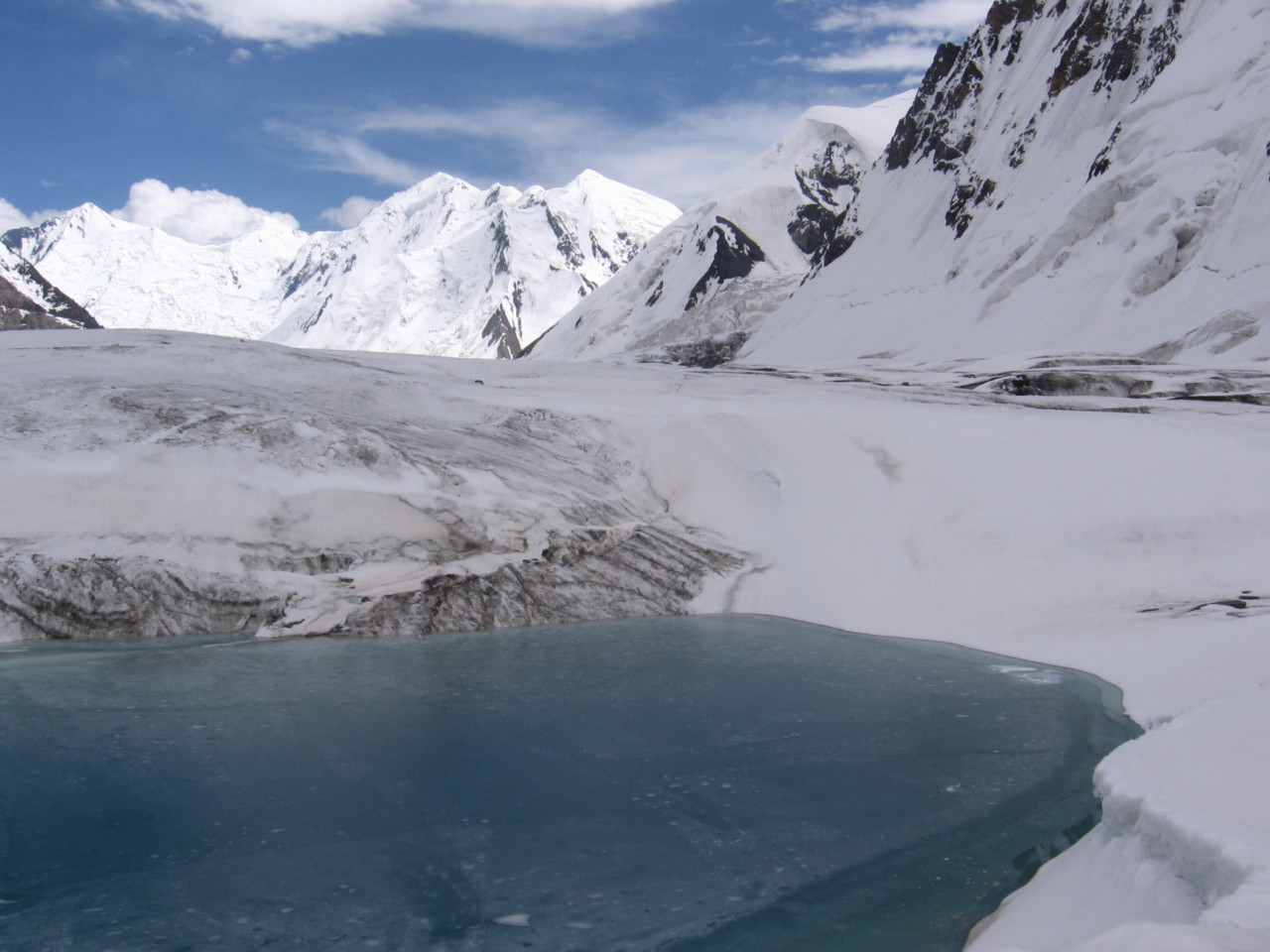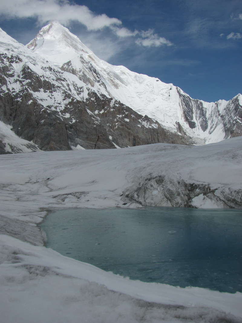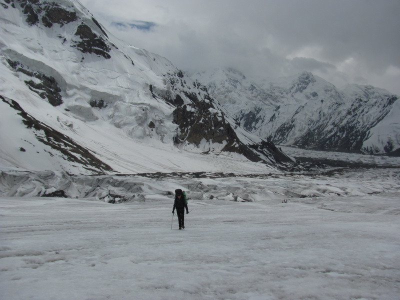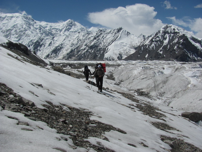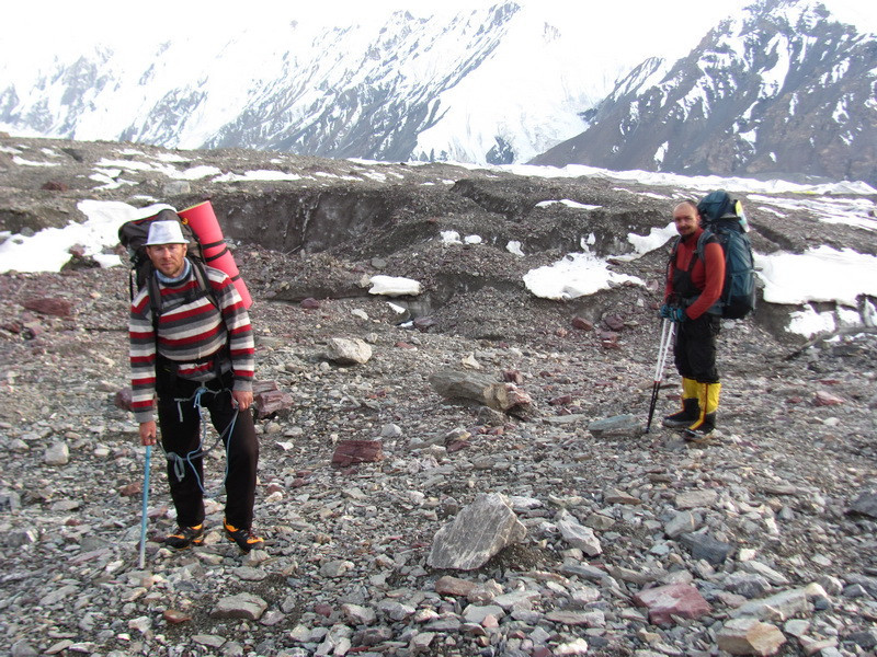 Двигались иногда по границе с хаотичными моренами. Поперечник ледника необычайно широк. Множество протаявших колодцев, ручьев, где-то сливалась чистейшая голубая вода, где-то серая и мутная. Местами были сколы прозрачного льда, местами грязные моренные конгломераты. Хан Тенгри отдалился и спрятался довольно быстро. Пик Победы тоже довольно скоро поменял ракурс, но виден был более долго. Двигались мы ближе к левому борту ледника. Где-то на моренных выходах правого, остался промежуточный лагерь для трекеров «Дикий». Он хорошо виден с ледника Семеновского. Вертолет его не снабжает. Возможно только при открытии и перед закрытием. Все необходимое носят потеры. Носильщики, как правило, молодые люди, нанимающиеся как сезонные рабочие.