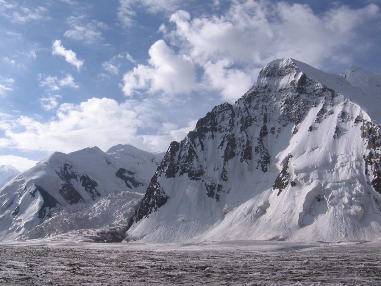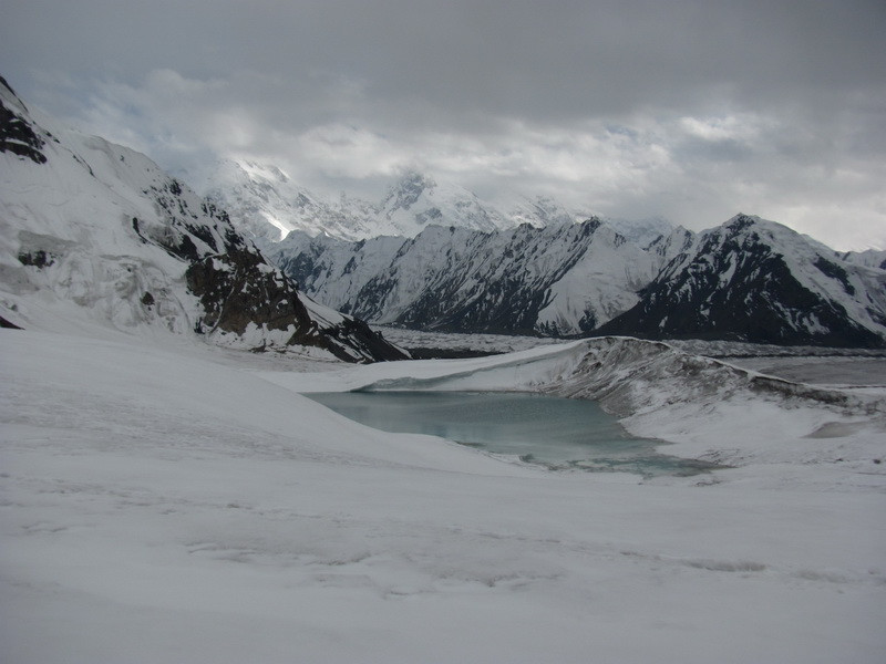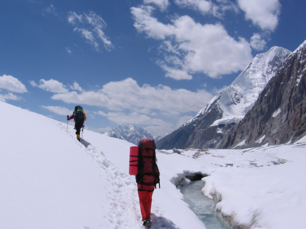 Двигались иногда по границе с хаотичными моренами. Поперечник ледника необычайно широк. Множество протаявших колодцев, ручьев, где-то сливалась чистейшая голубая вода, где-то серая и мутная. Местами были сколы прозрачного льда, местами грязные моренные конгломераты. Хан Тенгри отдалился и спрятался довольно быстро. Пик Победы тоже довольно скоро поменял ракурс, но виден был более долго. Двигались мы ближе к левому борту ледника. Где-то на моренных выходах правого, остался промежуточный лагерь для трекеров «Дикий». Он хорошо виден с ледника Семеновского. Вертолет его не снабжает. Возможно только при открытии и перед закрытием. Все необходимое носят потеры. Носильщики, как правило, молодые люди, нанимающиеся как сезонные рабочие.