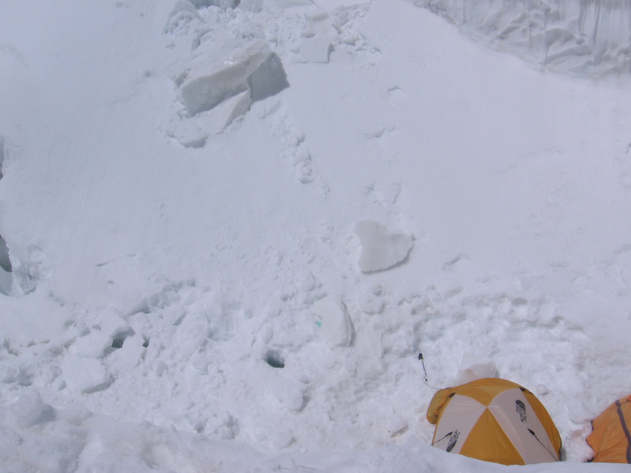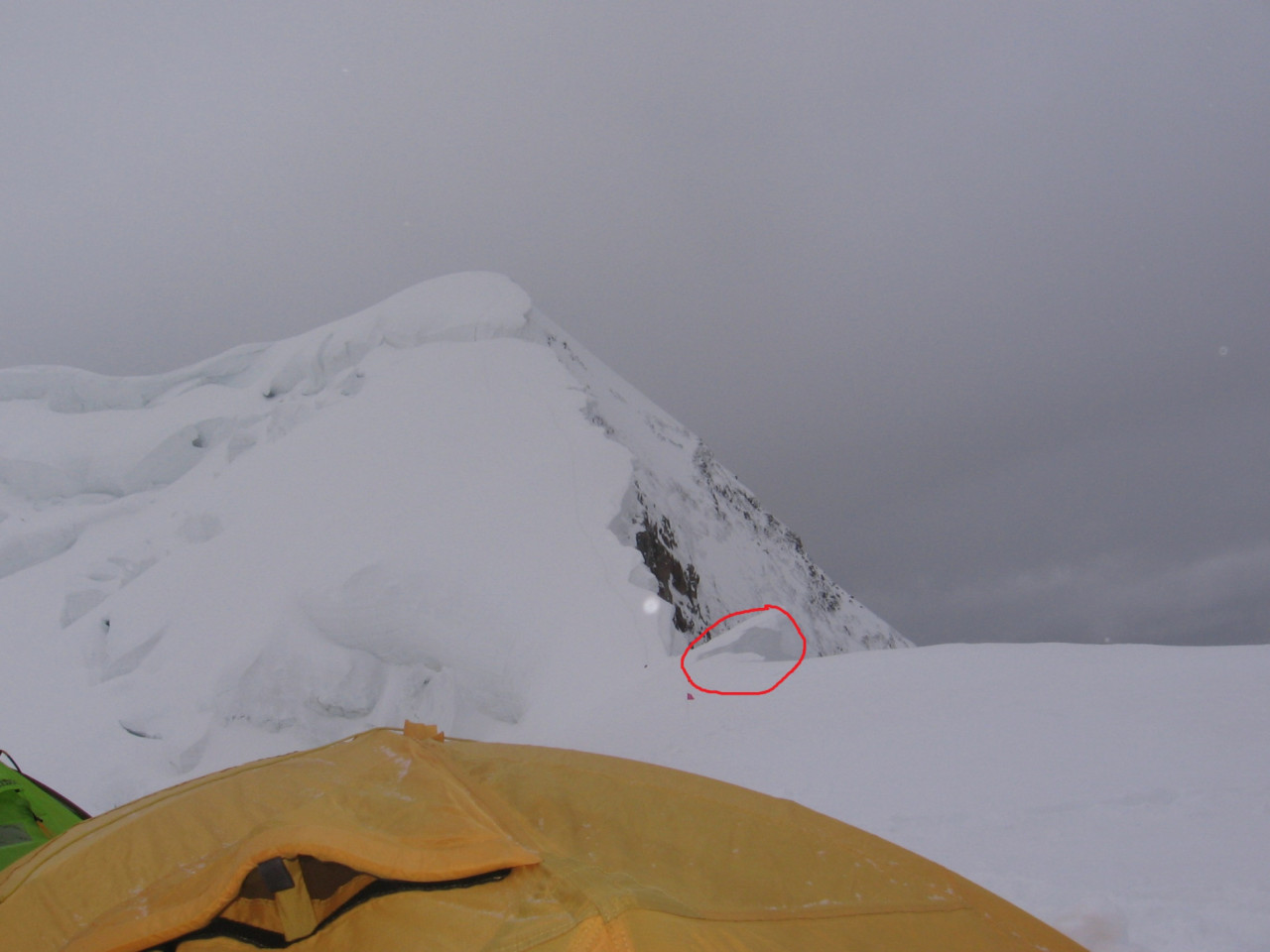 29 июля Глаз на гребне между Хан Тенгри и Пиком Чапаева, не доходя пару минут до палаток лагеря на высоте 5900 при плохой видимости шел в направлении на вешку и обрушил в северную сторону многотонный карниз. Но и Глаз и следом шедшая Маша остались волею судьбы на гребне.