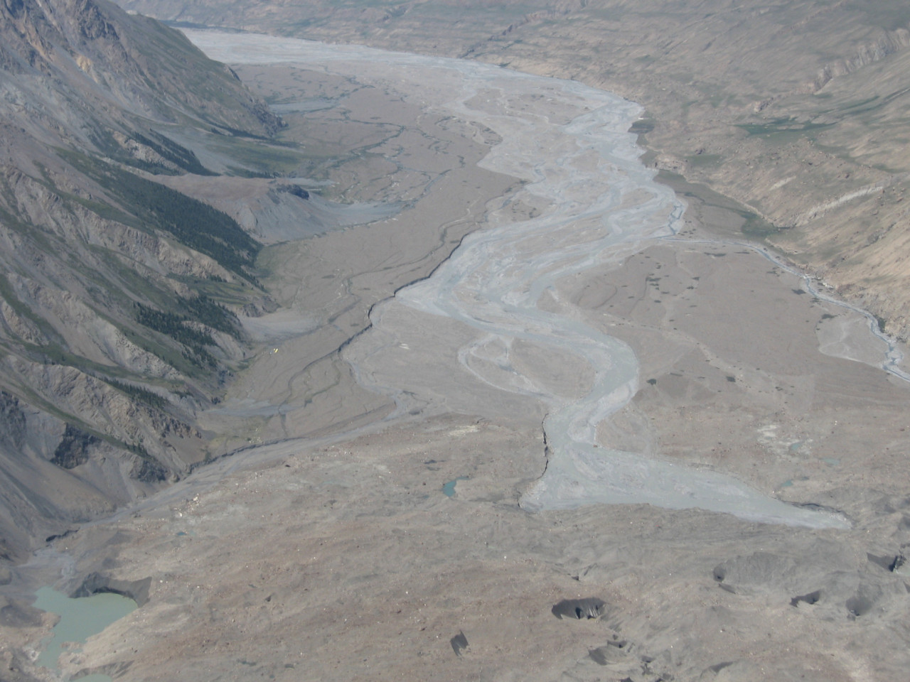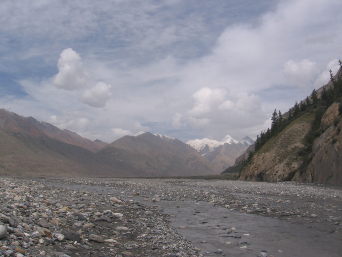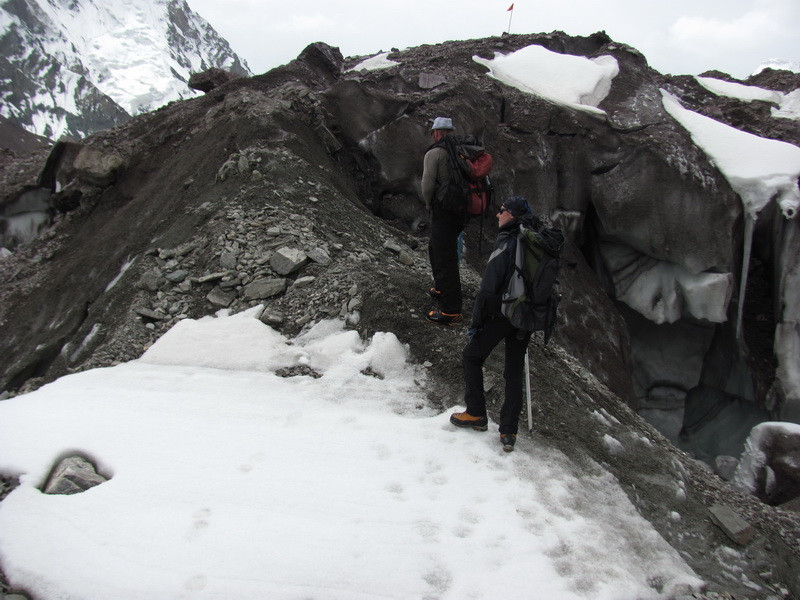 Последний час шли вдоль симпатичных ледовых нагромождений. Срезы нагромождений чистейшие. Сверху в голубеющие лужи почти непрерывно срывались камни разных размеров. Казалось, что ледник живой. Но он и был живым. Навстречу прошли с десяток груженных потеров. Они и снабжают эти лагеря для треккиновых переходов. Появились первые отдельные корявые ели на склонах и, наконец, ледниковый моренный чехол закончился. Дальше открывалась нашему взору необозримая широкая долина.