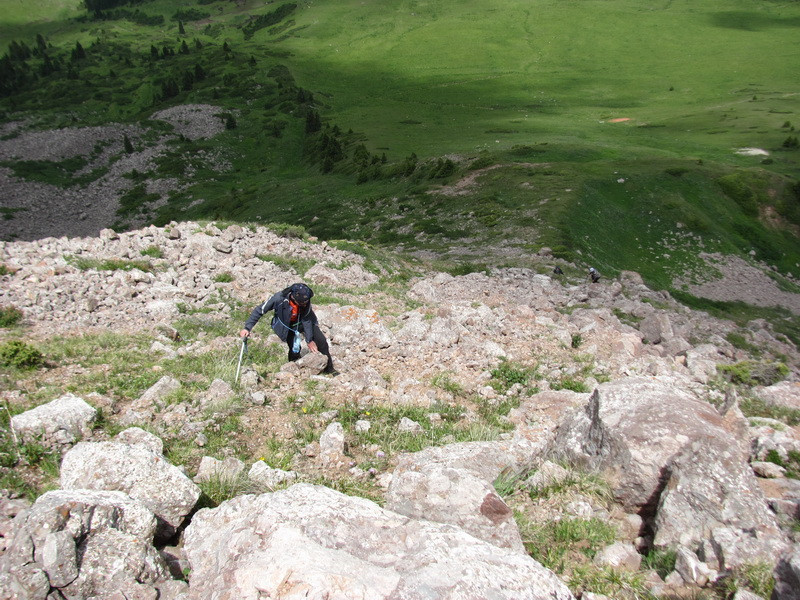 На нижнем траверзе вдоль ручья двигались хипстеры. Хипстеров пропустили вперед проекции полета камней. Немного разбрелись. Скорость спуска по конгломератному склону была у нас разной. Зато веселый Глаз нашел частично присыпанную породой треккинговую палку. Палку прихватил трофеем. Хоть она и без опорной резинки.