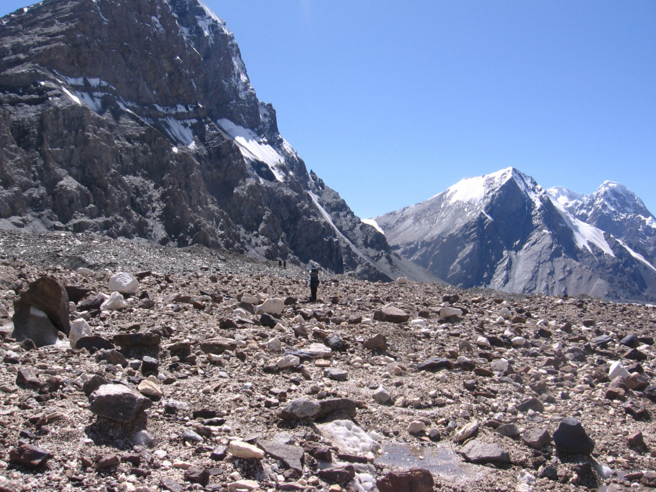 Погода солнечная. Тянь Шань нам улыбался. Не сильно затягивая время, собрали лагерь и двинулись якобы вниз. Оно никак не казалось, что вниз. По леднику, сначала вверх потом вниз и так бесконечно. Сразу прошли мы мимо потерпевшего в прошлом году при посадке крушение вертолета. Он лежал в углублении среди камней и льда, неестественно выделяясь своим закамуфлированным боком, похожий на доисторическое животное со сломанным хребтом.