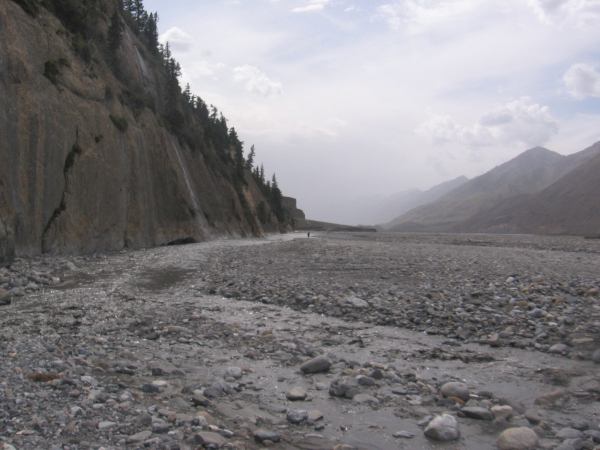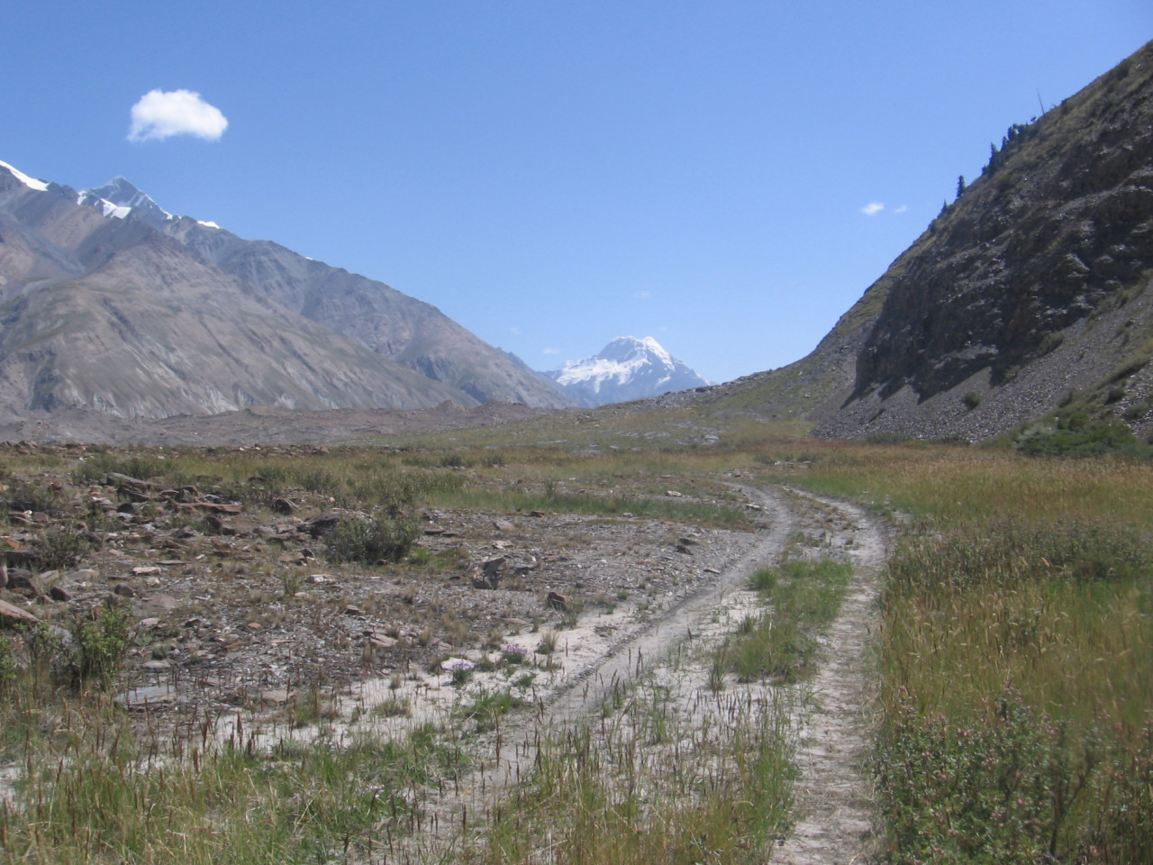 Идти было, конечно, очень дохуя и очень уныло. Правее нас странников простиралась целая система проток основной реки Инылчек. Мы двигались, стараясь дружно и кучно, то по подобию дороги, то по полупустыне со скудной флорой и очень часто сети неглубоких ручейков. Сбегали они с левых склонов. Так прошел один час, другой, третий. Несколько растянулись. Растянулись в пределах видимости. Ноги шли, но голеностоп и суставы стопы были натружены и изношены. Тяжелые горные ботинки не хотели давать бодрого темпу.