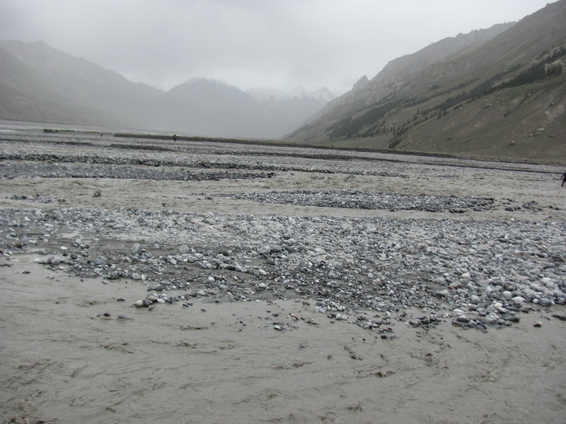 Трекинг обратно около 70 км по леднику Южный Иныльчек вниз в конце похода оказался трудоемким и утомительным. Особенно путь по однообразной неровной морене. Подстегивало время, но мы справились. «Апофеоз Прокопенко» – форсирование довольно широкой и мутной реки с бурным после обеда течением уже почти перед Ат Джайлоо. Прокопенко бесстрашно показал оптимальный проход среди мчащейся коричневой воды. В пойме реки Инылчек наблюдали пыльную бурю.