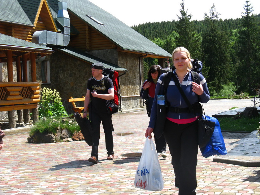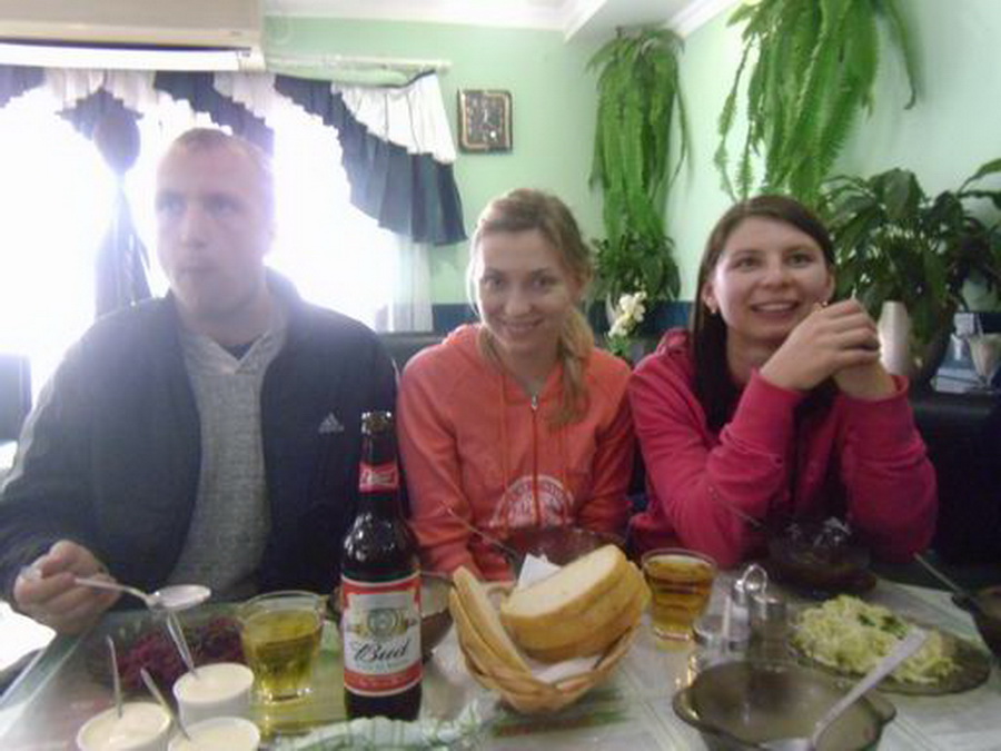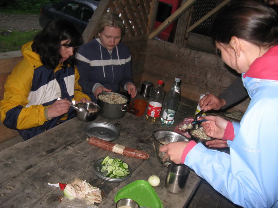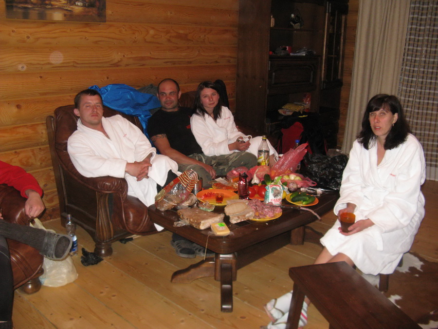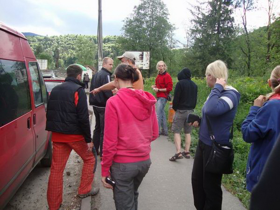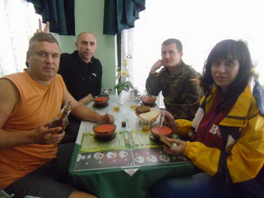 Группа слегка подустала. Как и утром, все разместились по своим местам в автобусе и не спеша преодолели последний участок спуска. А у самого лагеря уже ждали. Добрые карпатские полицаи. Оказывается, днем в горах была стрельба, травмировали какого-то хохла, и власти пришли к мнению, что специально обученный белорусский десант несомненно к этому причастен. После полуторачасового допроса, когда уже со слов было записано верно, и было обнаружено, что одно из колес красного путника испустило дух, все собрались за большим столом уютной харчевни, дабы пополнить растраченные за день силы при помощи пищи и неизменного напитка. Так сказать, подзарядиться.