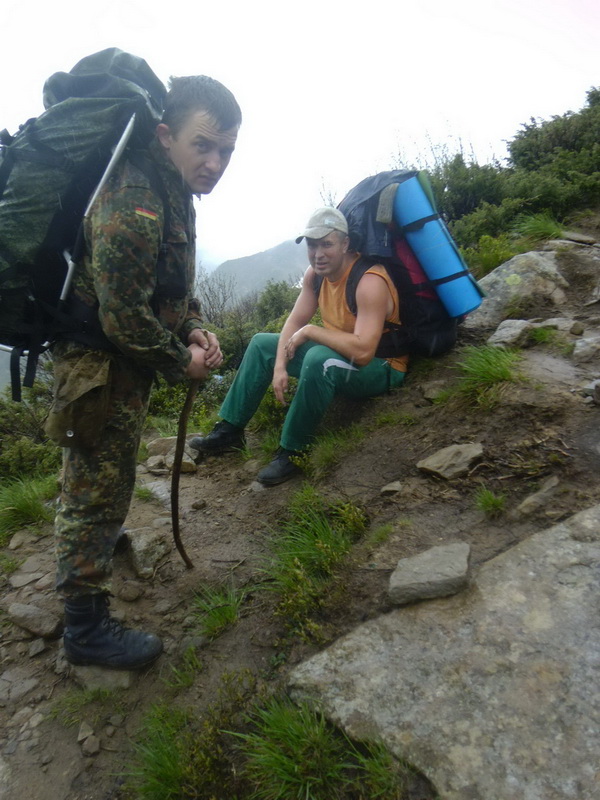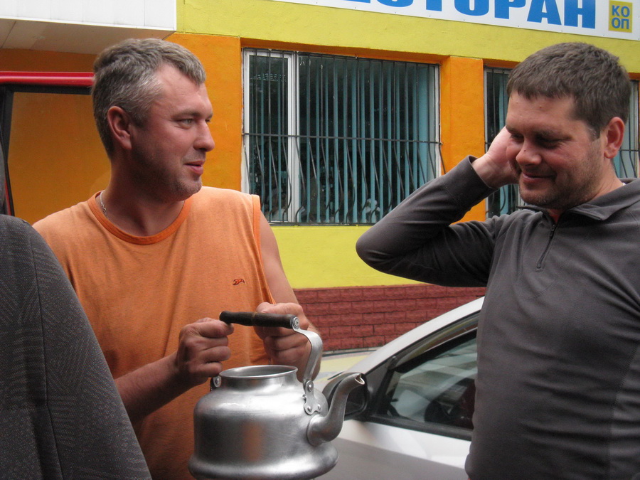Часть людей – М.М., Белка, Ашег и Лёва, следуя заранее утвержденному Ашегом плану Ашега, устремилась на двух авто к конечной точке маршрута с целью оставить там №626 для транспортировки по окончании грядущего восхождения водителя к красному лайнеру, который, опять же по плану Ашега, должен остаться в начале восхождения. Всё же просто. Добравшись сравнительно быстро (30 км – 1,5 часа) до цели, ясноглазый Лёва уверенно заявил, что неплохо бы было пройтись электросваркой по его железному мулу, ибо он подустал и может не доставить должным образом часть группы на Родину. Начался опрос местного населения на предмет наличия сварочного аппарата. Население убедительно заверило, что послезавтра будет. Лёва прогнал остатки волнения и уснул с миром. Следующие 1,5 часа были близнецами предыдущих, но зеркально.