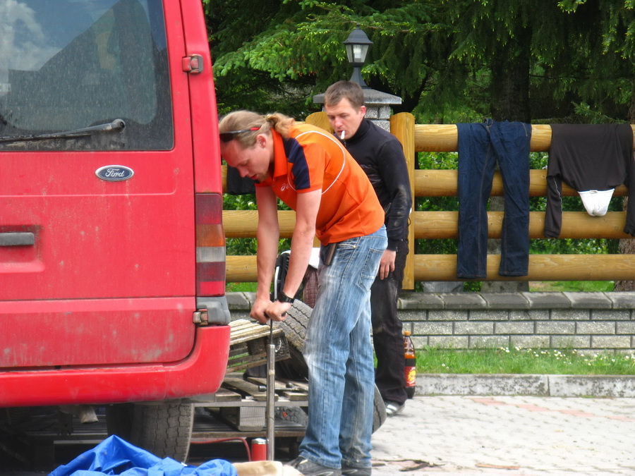 Освободив готель, часть группы профессионально и сноровисто заменила колеса у верного краснобокого скакуна,