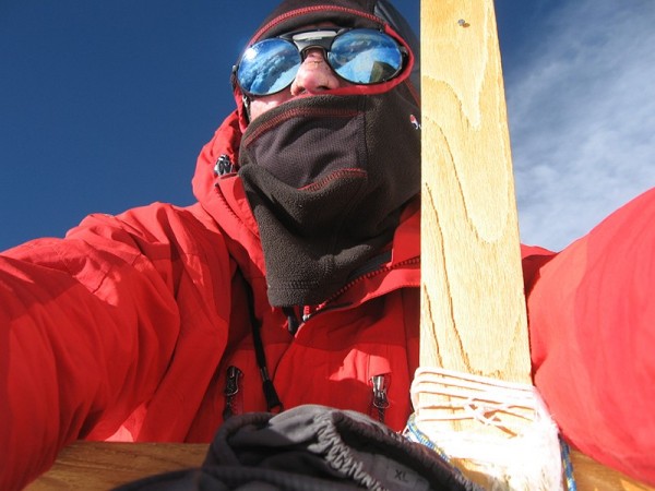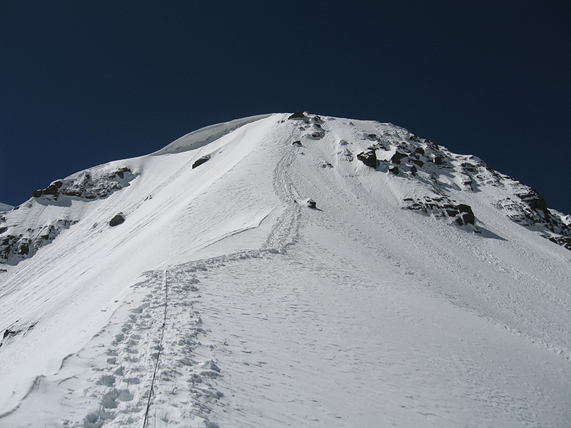 В верхней части маршрута поджидала ещё одна неприятность. Фирновая корка, образовавшаяся за солнечный день. Когда ты ставишь ногу, она держит, а под нагрузкой проламывается, и нога с высоты 20-25 см ударяется жёстко в основной фирн или скалы. Началось убивание ног, но тогда на мелочи внимание не обращалось. Просто надо было долбить тропу вверх с дополнительным расходом сил. Скорость последних два часа была где-то 300 м в час, приходилось останавливаться и дышать. Верхняя часть горы представляет собой небольшое плато, вершинный тур находится правее, и не просматривается. Поэтому я выбрался и растерялся. Либо делать фото в любом месте, либо полчаса побродить в поисках. Начал осматриваться, и увидел, в направлении направо, торчал кусок незанесённых перил. Спасибо кому-то за не столь очевидную необходимость пожумарить, но за отличную подсказку где вершина. Через 10 минут я был у пирамиды с крестом. Достал навигатор, включил. Достал фотоаппарат, сделал несколько снимков, на фоне креста, что получится, то получится. Снял точку, высота отображалась 7005 метров, не стал изменять. Доел гематогенку, глотнул чая. Всё заняло 15 минут. Погода склонялась к перемене, или просто вечерело, но надо вниз, именно валить. Как можно быстрее, чтобы по максимуму прихватить светлое время. Я и валил, как мог, но впечатляющей скорости не получалось, больше походило на бродяженье вниз. Началось добивание ног на спуске. Прогноз не врал, около девяти резко потемнело и начало снежить. Теперь беспокойство вызывало то, что внизу занесёт мою тропу, и можно уйти ниже гребня на сбросы, но решил, там внизу и буду смотреть. Спала опять кошка, в спешке плохо закрепил фиксатор, и через пару перильных верёвок, она спала опять. Всё, потерялись фиксатор и пластина. Находился уже ниже стоянок 6400, время более 23 часов, кошку в рюкзак. Допил остатки чая, и начал спуск с одной кошкой. На перилах проблем особых не было, и даже спускаясь по заснеженным скалам можно было снимать и вторую кошку. Немного нервировали перестёжки на станциях. Можно было становиться только одним боком, нога в кошке ниже по склону, без кошки выше и в упоре на левую. Всё делал через самостраховку. Но неудобство позы и необходимость устойчивости левой ноги для общей устойчивости съедали десятки секунд на каждой станции. Поэтому пытался эти секунды компенсировать скоростью дюльфера. Что-то среднее получалось. После полуночи внизу загорелся фонарь. Я подумал, что кто-то для меня повесил маячёк, и поблагодарил за заботу. Перила закончились, и теперь был участок склона с углом 25 градусов, а ледоруб ниже на нитке перил. Но тут взял в себе в союзники наметённый снег. Нога без кошки скользила до образования ступеньки, после чего её можно было подгрузить маленьким шажком. Так неспеша, но уверенно и преодолел этот участок склона. Вышел к перилам, дошел до ледоруба. За выступом гребня не было видно лагеря и фонаря, но я отчётливо слышал внизу голоса. Даже с полуотключенными мозгами понял, что народ готовится на восхождение. Снега нанесло не много, и в свете фонаря хорошо просматривались следы. Ничего экстремального, надо было просто прийти в лагерь. Неожиданно из-за выступа гребня появились фонари навстречу. я остановился, пропустить восходителей. Первыми шли Андрей и Пётр, следом двигались Александр и Дима. Я пожелал им удачного восхожд