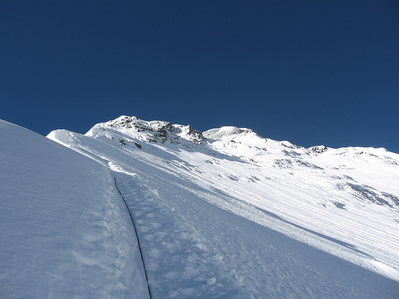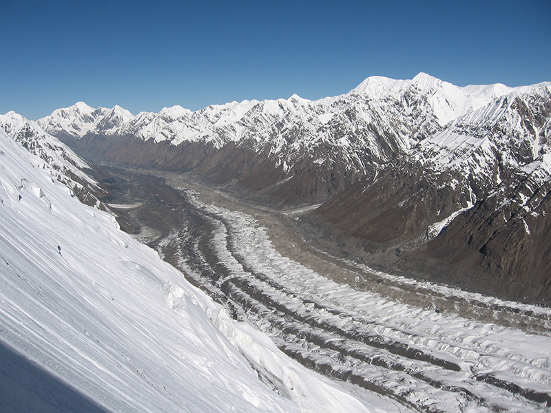 Будильник поставленный пораньше, чётко отработал подъём. Самочувствие хорошее. И если в прошлую ночёвку пришлось подлечить голову, то в этот раз организм показал полную адаптацию для этой высоты. Собрался и вышел в 6 часов. Снег подмороженный, на ступенях держит чётко. Подыматься не то чтоб легко, но значительно легче, чем кода пытались пробиться в снегопад в прошлый раз. По дороге узнаёшь места на склоне где уже проходил. Темп держал 50х10 минут. Шёл на ровном дыхании через нос, понимая, что сегодня буду в лагере два, а чуть раньше или позже значения не имело. Спустилось вниз, навстречу, пару человек, наигравшись в этом сезоне с горами. Солнце изумляло, мороз отступал, становилось всё теплее. Правда вид открывался только по долине ледника Северный Иныльчек, в обе стороны. После снегопадов, преобладающе подавляющим стал белый цвет, оставив только небу его синеву.