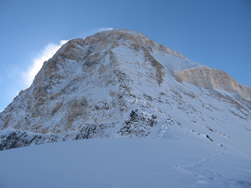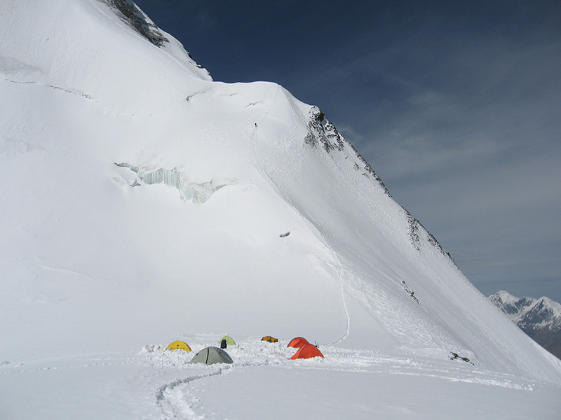 Неожиданно сверху спустился альпинист и начал возню возле своей палатки со снегом, джет-бойлом и чаем. Наконец, я понял, процесс благополучно закончился. Я вылез и помахал ему рукой. Он поздоровался, и спросил, говорю я по русски или английски. Сошлись на русском, английский мой полный бэд. Мужик, Алекс из Бостона, живший ранее в России, и решивший вспомнить молодость. Ходил на купол для акклиматизации. Дело уже к вечеру, надо готовиться к завтрашнему выходу, ужинать, готовить чай в термос. Как только солнце зашло за хребет, сразу резко опустилась температура, стало морозно. Даже по ощущениям, значительно холоднее чем в лагере на 4500. Перед сном прибил головную боль ещё таблеткой Цитрамона. Пришлось ночью несколько раз выходить под действием мочегона.