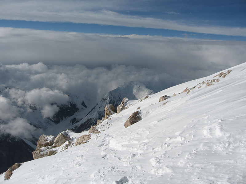 Проснулся под полоскание палатки ветром. Вылез в метель, она как и вчера начиналась с низовой позёмки. Залез обратно в палатку и начал обдумывать ситуацию. Положение для ожидания у меня хорошее. Если погода, можно упереться и за день подняться с рюкзаком в лагерь 6400. Ещё день погоды и можно сходить вершину и спуститься в третий лагерь. Если непогода, за день спуститься в лагерь на леднике. Провёл ревизию продуктов. Каши хватало с запасом, колбасы и сухого мяса с небольшим запасом, сладостей и сахара в обрез. Запас газа достаточный. Снег повалил и сверху. Всё опять зима, сижу пургую и жду погоды. Начали спускаться, а точнее подыматься на Чапаева восходители из третьего лагеря. Сходил на купол к Алексу. Он и не заметил, что появилась моя палатка и был очень удивлён, что он здесь не один. Алекс принял решение спускаться вниз, по-моему его здорово прибила высота и восхождение. Он уже собирал свои нехитрые пожитки, я пожелал ему удачи и попутного вертолёта. Удалось пообщаться с парнем из Словакии, возвращающемся с горы. Они вчера спустились в 19 часов, все группы вернулись в лагерь после восхождения и всё в порядке. Но погоду он не знал. Надо было дожидаться прихода казахских гидов. Они уходили последними сделав свою работу на горе, теперь дорабатывая спуск. Их прогноз неутешительный, погоды не будет. Время 14 часов, понятно что её сегодня не будет, а что завтра? Раскинул в очередной раз возможностями. Если завтра погода, то можно подняться до 6400 и там уже дожидаться погоды на штурм. Но есть и второй вариант, перенести лагерь на седло (третий лагерь) и учитывая сегодняшний день отдыха завтра по погоде попытать счастья восхождения на гору. Снег продолжался, убивая энтузиазм сниматься с налёженного места. Значит надо сделать чай. В общем я бы сегодня не двинулся с места, но тут вмешался случай. Неожиданно на купол вылез человек. Ну вылез, вылез от второго лагеря, наверно акклиматизируется. Он отдыхает, я чаёк допиваю. Неожиданно появляется второй и они направляются мимо меня в третий лагерь. Уточняю погоду, прогноз погоды на завтра - вероятность ясной 70% утром, вечером снег до 20 см. Это шанс. Быстро собираю, вещи, пакую рюкзак, немного пришлось повозиться со сборкой палатки на ветру, и вниз, на спуск в третий лагерь. Между перемычкой, или точнее перевалом, и склоном Чапаева есть разрыв или скорее бергшрунд высотой около семи метров. Вниз это хороший дюльферок, а вот вверх, но это будет следующий раз. От купола до лагеря три час спуска. Нахожу старые площадки и слегка притоптав свежий снег ставлю палатку. Мимо идёт гроза и началось пение ледоруба, чувствую как начинает электризоваться одежда всё искрит от движений. Немного жутковато, забрасываю нераспакованный рюкзак и залезаю в палатку. Здесь нет статического электричества, прихожу в себя и начинаю ковыряться, доставая вещи. Где-то недалеко громыхнуло, потом ещё раз, но уже дальше. Через десять минут вылез, всё, статический заряд ушёл с тучей. Укрепил палатку. Передо мной пришли гид Андрей и его клиент Пётр. Они завтра будут отдыхать, на гору не идут. Чуть ниже, 100 метров, располагается лагерь южан, с ледника Южный Иныльчек, но до них не докричаться, а специально спускаться-подыматься жалко сил. Через час в лагерь шумно свалились знакомые питерцы Саша и Дима. Они таскали с собой коммуникационное оборудование, и 
