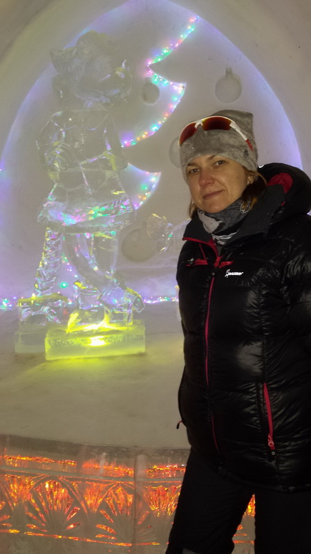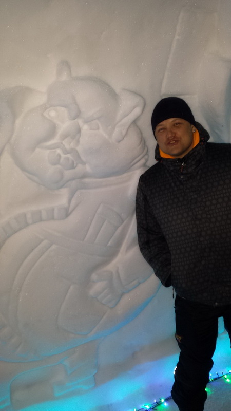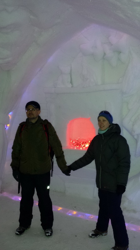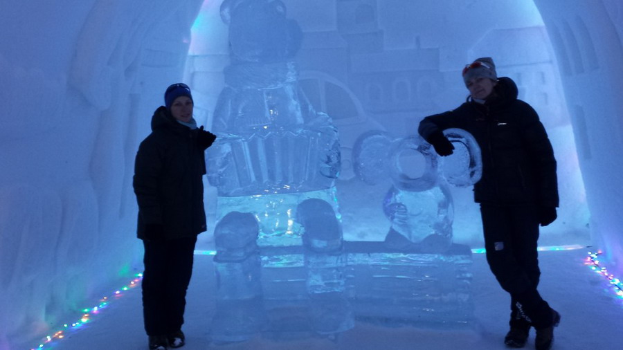 Погода опять испортилась. Низкая облачность и идет снег. Решили никуда высоко не ходить, а заняться этнографическим туризмом. Сначала зашли в местный музей. Сделан он, кстати, на очень высоком уровне. А после поехали в Снежную деревню – огромный дом из снега с многочисленными барельефами внутри. Площадь дома – 2000 кв. метров. А стены украшены сюжетами из советских мультфильмов. Над созданием музея работало 35 художников-скульпторов из разных стран, а сам он входит в книгу Гиннеса, как самое большое сооружение из снега.
